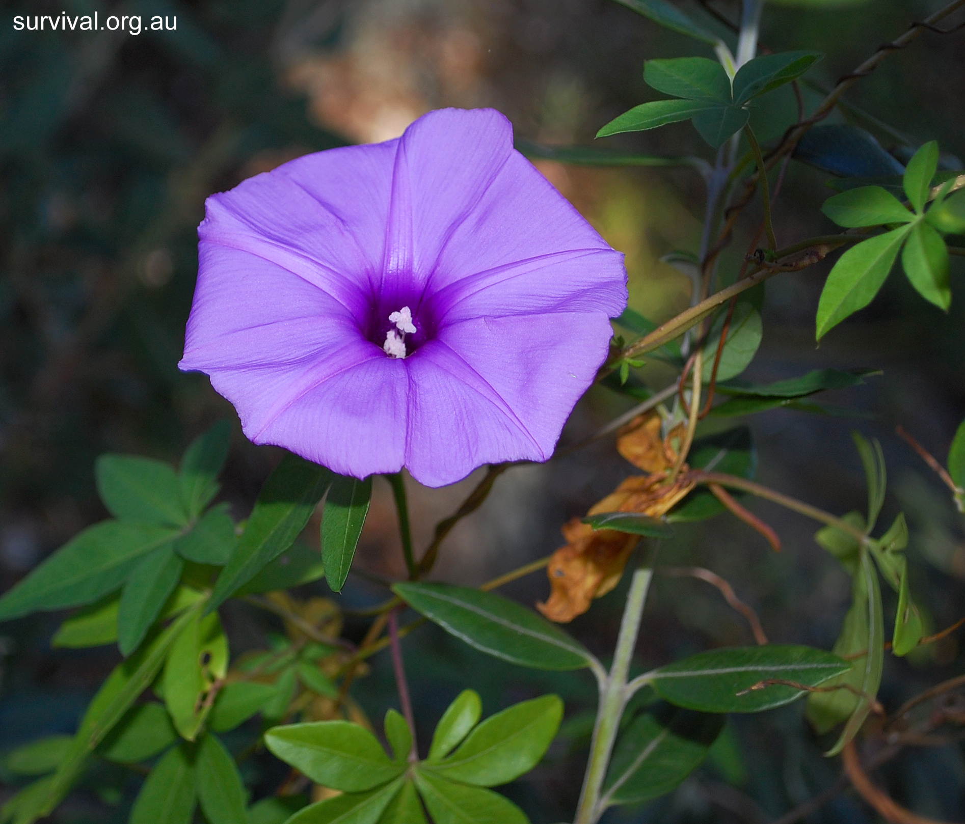 Ipomoea cairicaCoastal Morning GloryOther names: Mile-a-minute Ipomoea cairica flowers all year. The flowers are pink to purple, very occasionally white, with a darker coloured throat (the inside of the flower). There are about 500 species of Ipomoea in the world, and about 40 in Australia, some native and some introduced. Most of them are vines, climbing plants or ground-trailing creepers. Some are called "Bush Potatoes" and their tubers were highly favoured staple Aboriginal foods. According to Eat The Weeds, it has edible roots and stems though they are slightly bitter and both are slightly cyanogenetic. Roots were boiled, or, grated then roasted, no doubt to drive off the cyanide.