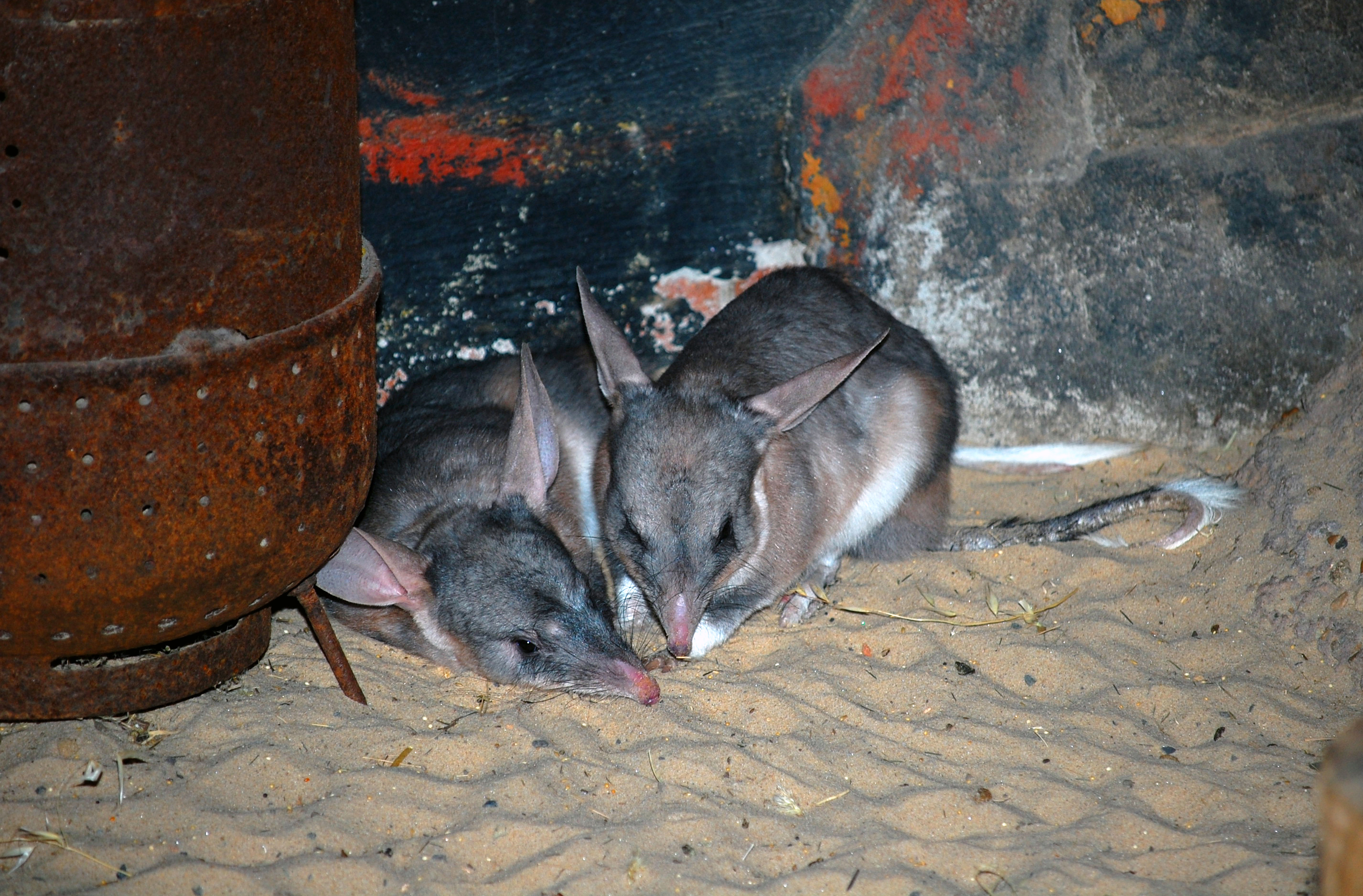 Other Names: Greater Bilby, Rabbit-eared Bandicoot, Rabbit Bandicoot, Dalgyte, Macrotis Family: Thylacomyidae Size: Head-to-body 30-55 cm, Tail 20-29 cm. Weight: 800-2400 grams. Distribution: Their distribution used to be much larger, over much of arid inland Australia. Now they only live in scattered colonies in parts of NT and WA and a tiny part of QLD. Status: Vulnerable Habitat: Desert country. References: Menkhorst and Knight. About the BilbyBilbies are nocturnal and live in long, deep burrows during the daytime. Weight: 800-2400 grams. Diet: Bilbies forage through topsoil for arthropods, tubers (plant roots) and fungi. Breeding: Births mostly in March-May but can be any time in good conditions. They usually have litters of two.