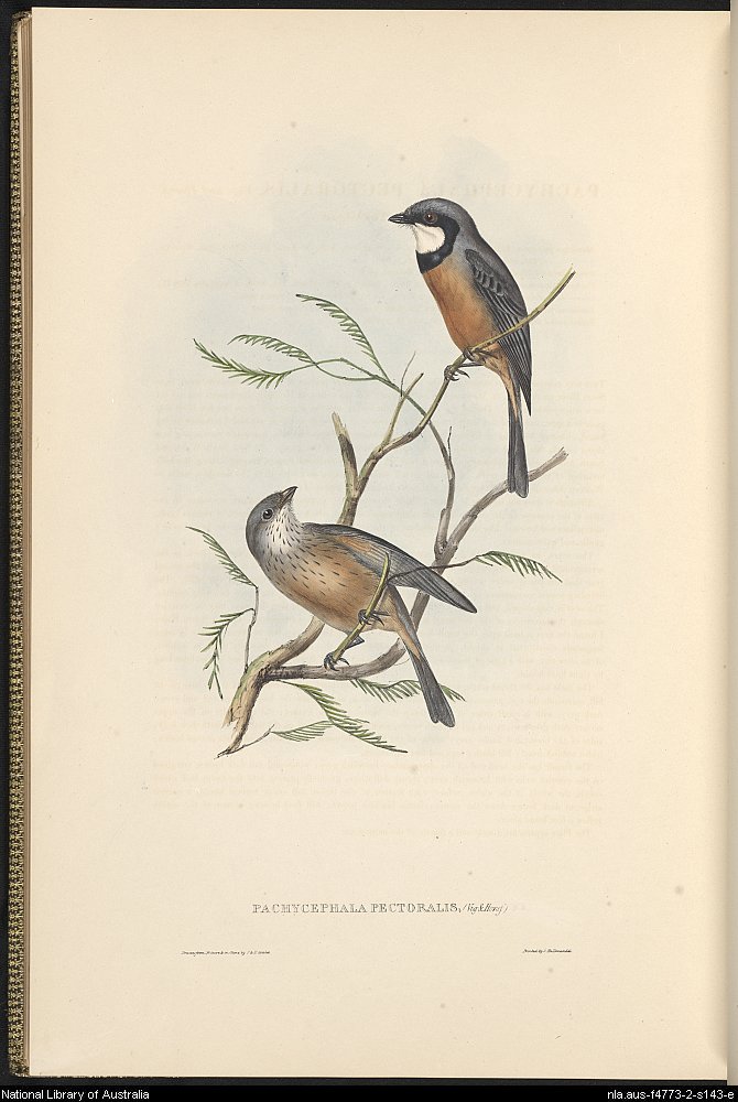 Gould call this plate the Golden Whistler (with the same scientific name), but it looks exactly like the Rufous Whistler, not the Golden Whistler. I'm not sure what is going on with this.