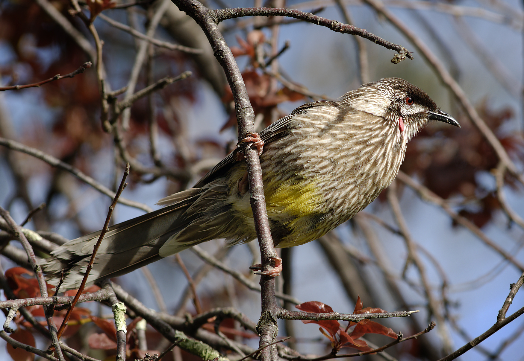 The Red is common in parts of Sydney and many other areas. It is found in the Blue Mountains and is extremely common in the Upper Blue Mountains. It looks a lot like Little Wattlebird, but it has a red flap of skin under its eye (the "wattle"), and it is a lighter grey colour and looks less "spotted". Its underside has yellow colouring on it.