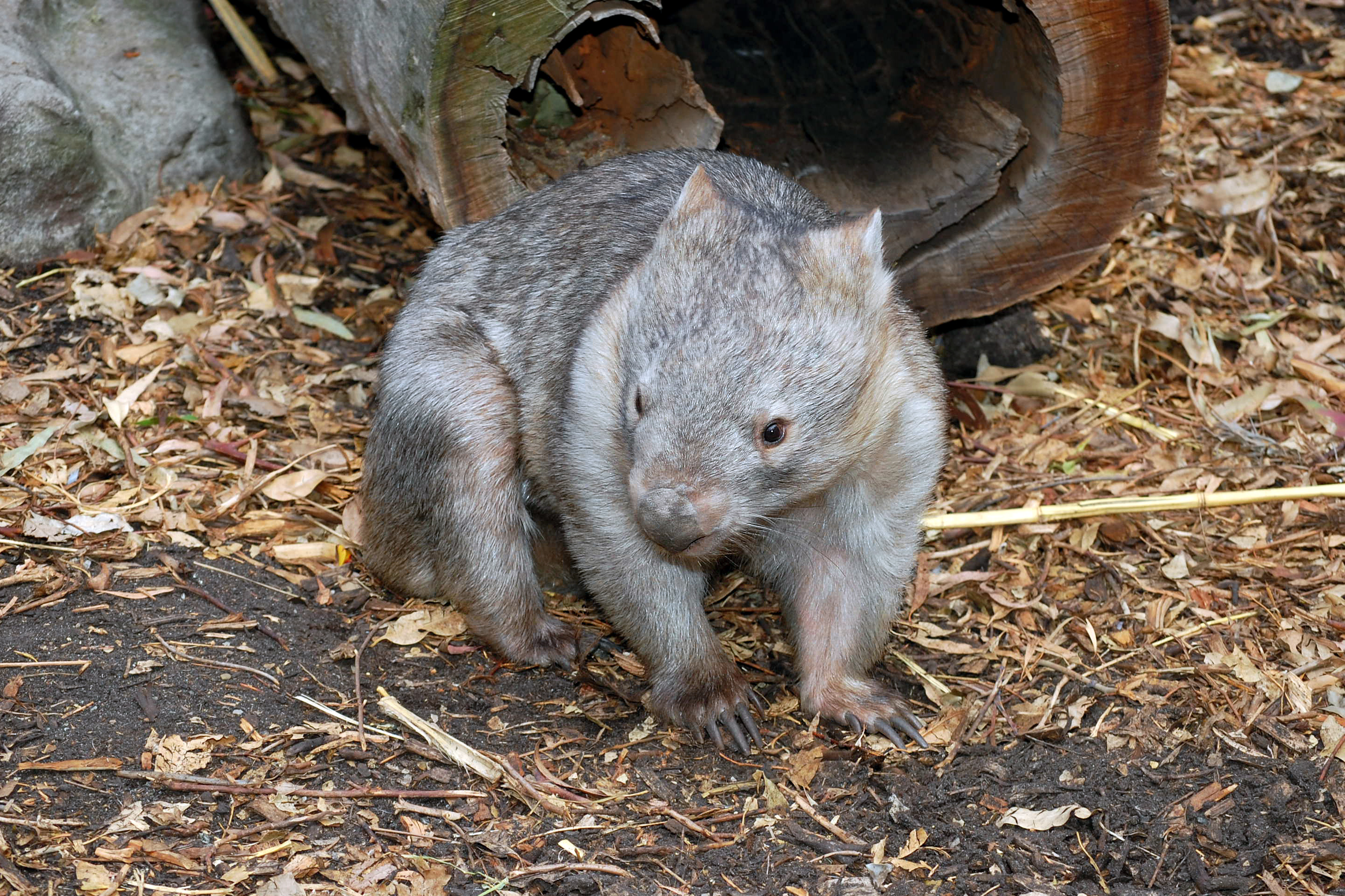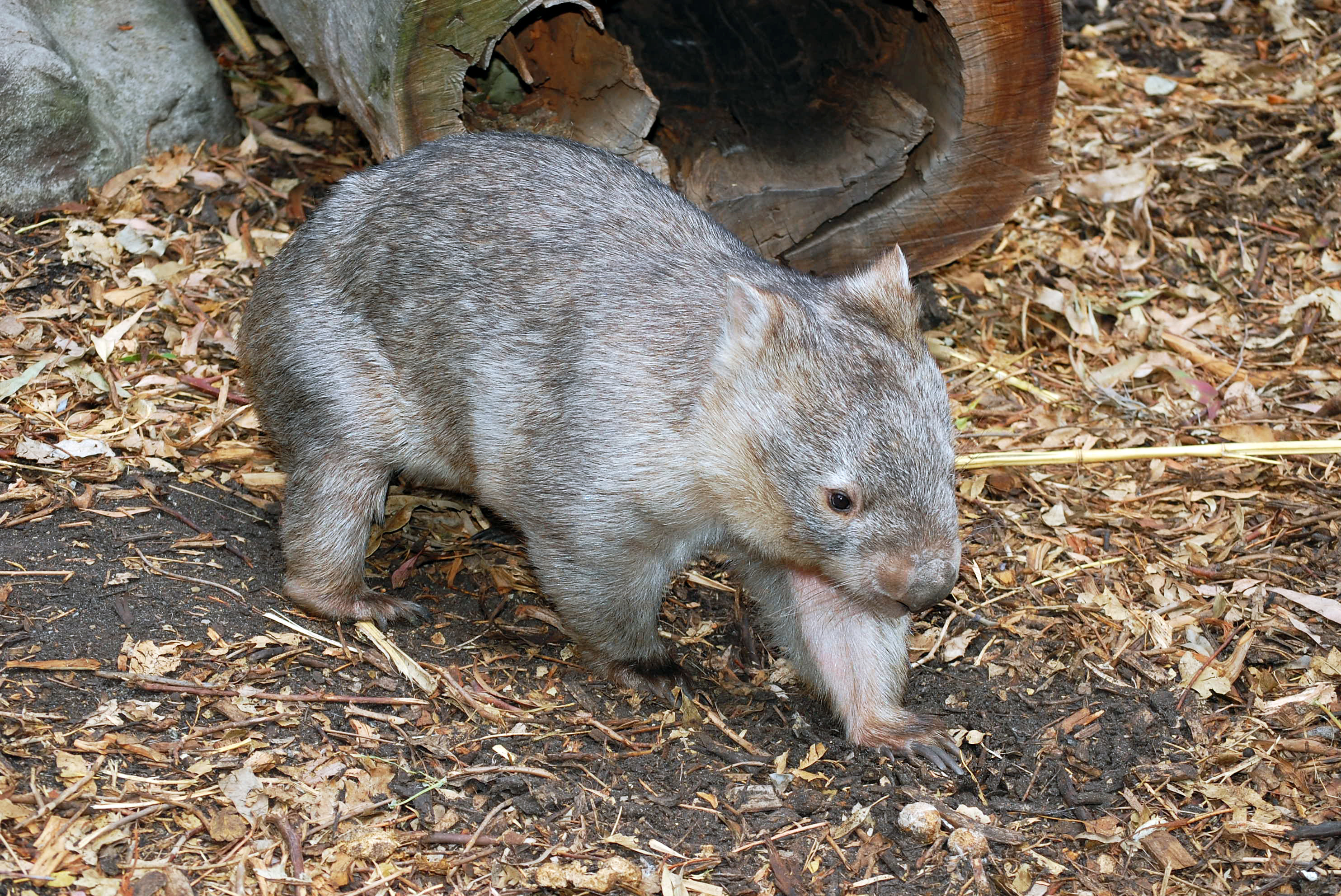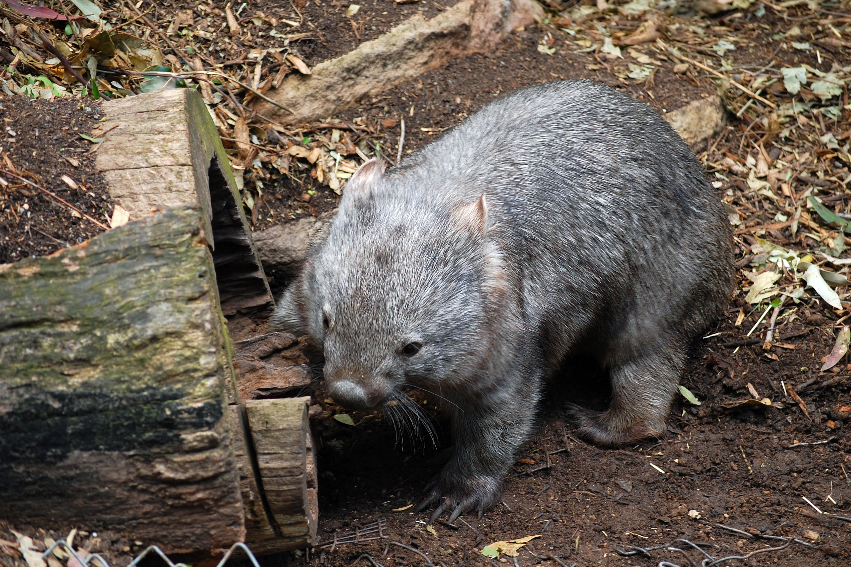 Other Names: Coarse-haired wombat, bare-nosed wombat Family: Vombatidae (wombats), 3 living species. Size: Head-to-body 85-120 cm. Tail 2-3 cm. Distribution: Patches of Southeast Australia (NSW and Vic.), a tiny part of Southeast SA, all of Tasmania. Status: Least concern. Protected in Western Vic. Habitat: Wet and dry open forests, woodlands, scrubs and wet heaths to an altitude of 1800 metres above sea level. References: Cronin's Key Guide to Mammals, Van Dyck, Gynther and Baker, Menkhorst and Knight, Wikipedia. About the Common WombatCommon wombats look cute, cuddly and friendly but they are solitary and agressive. Mainly nocturnal. They live in burrows which can be up to 30 metres long and have several entrances. They can run at speeds up to 40 km/h over short distances (faster than a person can run). Traces: Scats are cube-shaped pellets about 2 cm across, dark-brown outside, fine green plant fragments inside, usually in piles of 4-8 in conspicuous places.