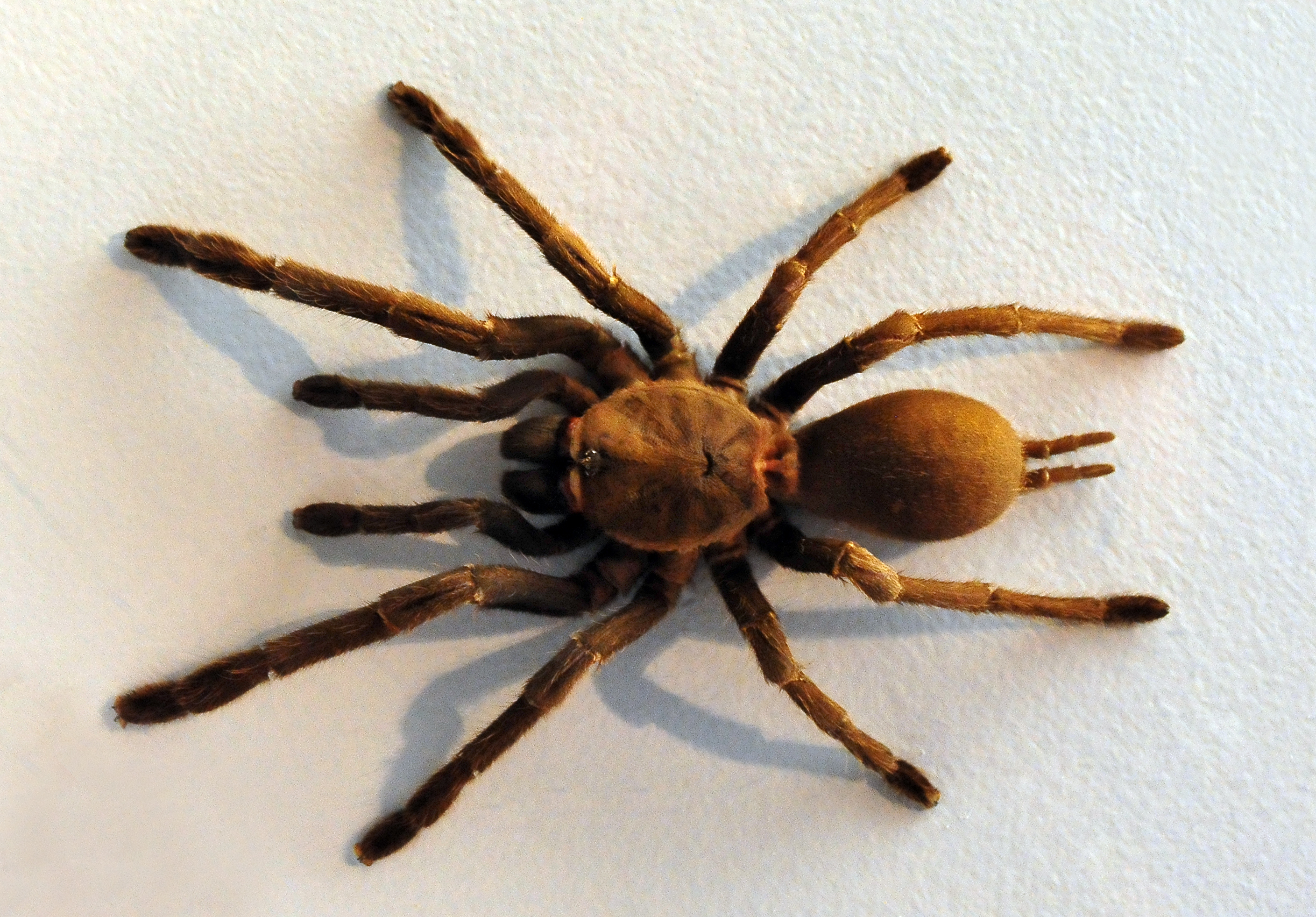 Other Names: Whistling Spider, Barking Spider, Bird-Eating Spider, Selenocosmia crassipes (the current generic name Selenocosmia has been wrongly applied to the Australian species and will be revised, the generic name Phlogius being reinstated). Family: Theraphosidae (Tarantulas), currently 7 known species in Australia, estimated total 30 Australian species, about 950 species in the world. Size: Male body length up to 70 mm, Female body length up to 90 mm. Legspan up to 220 mm (22 cm). Distribution: Throughout Mid-East and North Queensland. Other Australian tarantulas may occur more southerly, to North-Western Victoria. Status: Tarantulas are highly threatened by the pet trade which is responsible for about 2000 tarantuals being sold in each state each year. From the Australian Museum, "The species that is most often kept as a pet is often sold as Selenocosmia crassipes. However Habitat: Likes areas with plants. Lives in burrows in the ground up to one metre deep. May come to the surface in heavy rain. References: Whyte and Anderson, Framenau, Baehr & Zborowski, Wikipedia, Australian Museum. About the Eastern TarantulaThe Eastern Tarantula is Australia's largest spider. Diet: The Eastern tarantula has been known to eat small birds, hence the nickname "Bird-eating spider"; however, they typically eat large insects, small mammals and amphibians, such as cane toads and frogs. Danger: Wikipedia says a bite from an Eastern tarantula can cause up to six hours of vomiting, but is not fatal to humans. They can be fatal to smaller animals like dogs and cats within 30 minutes. Treatment: No antivenom is given (there is none available nor is it required). Note that dead spiders usually fade in colour, so nearly all the spiders will look blacker or darker in colour in real life than they do in the photos of dead spiders from the museum.