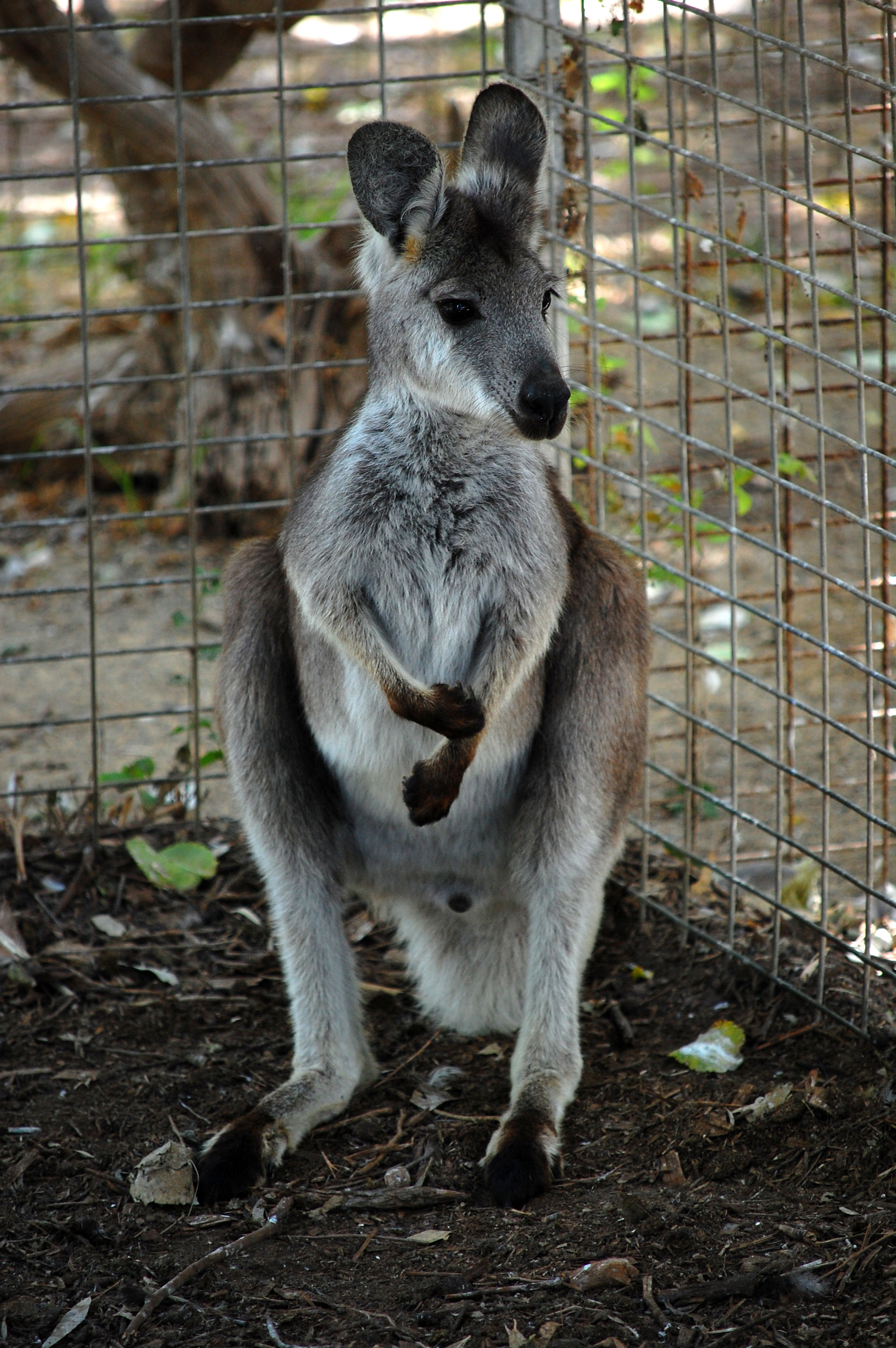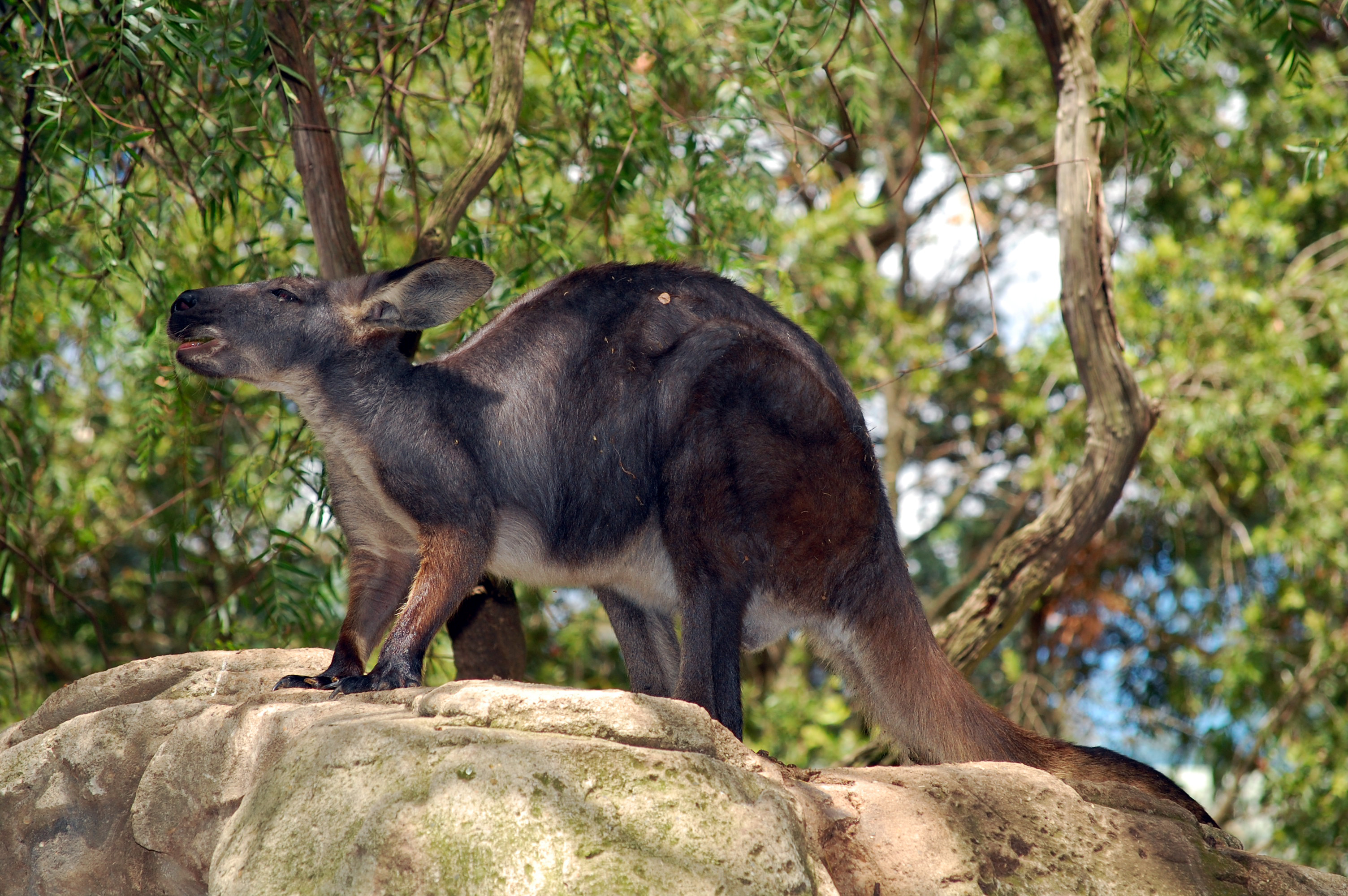 Other Names: Euro, Common Wallaroo Family: Macropodidae, the kangaroo family. Size: Head-to-body: Males 110 cm, Females 80 cm. Tail about 80 cm. Distribution: The subspecies called the Eastern Wallaroo lives in a strip within several hundred km of the eastern coast of NSW and most of the eastern coast of QLD. Other subspecies (which are mostly lighter and/or redder in colour) live over nearly all of Australia except for the south coastern regions of Australia. Not in TAS. Not in the tip of Cape York Peninsula (the most Northern part of QLD). Status: Widespread and common. Habitat: Rocky ranges, isolated hills, scarps and plateaus. They can live in most types of vegetation, from wet forests to desert shrublands and grasslands. References: Menkhorst and Knight. About the Eastern WallarooThey can be confused with the Grey Kangaroo, but look more stocky in general and their lower feet and legs are blackish coloured. The males are darker in body colour (almost black) than the females which are lighter grey.