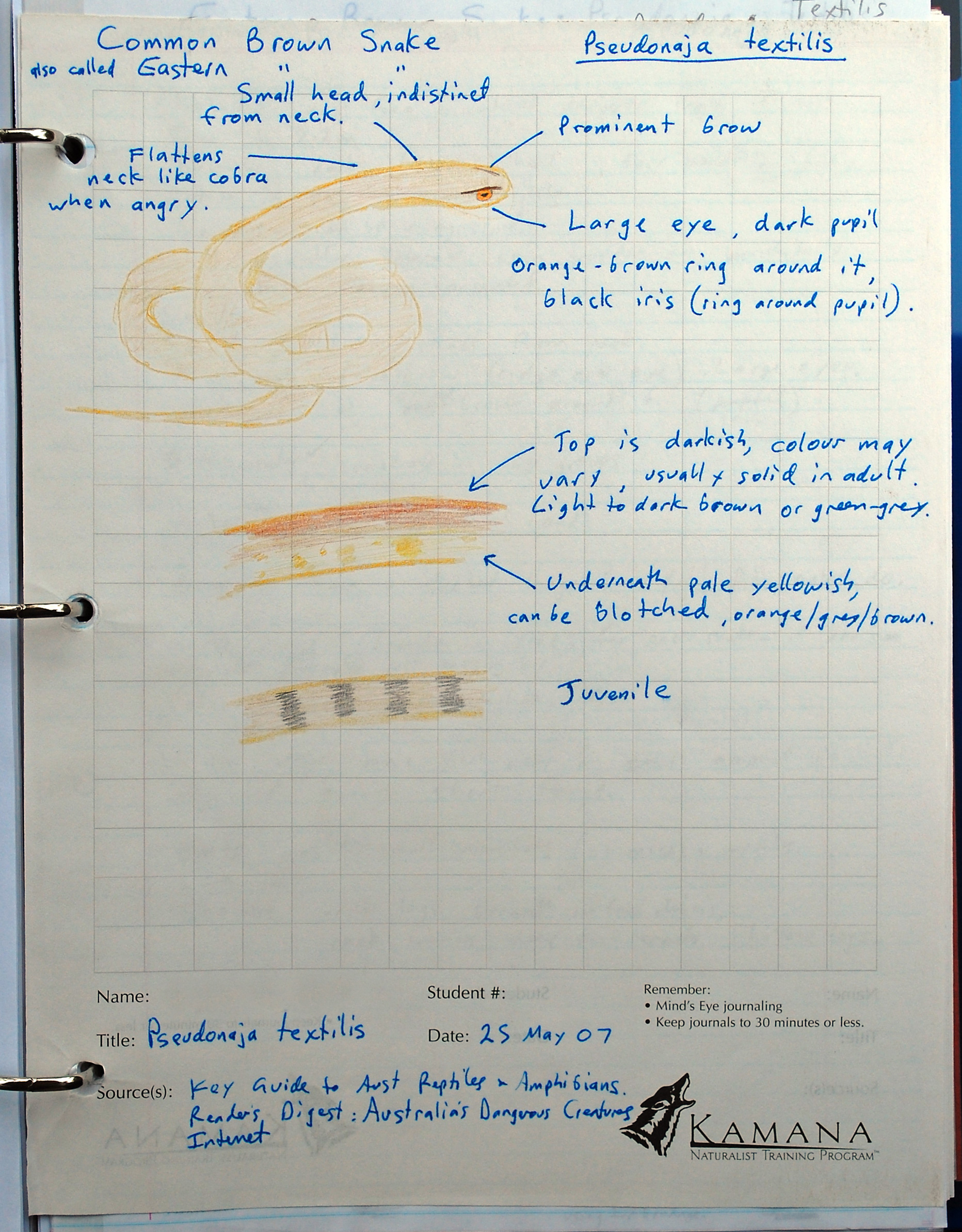 Below are examples of some of the work that you do as part of the Kamana program. The drawings are not meant to be artistic or even particuluarly technically correct. The main purpose of drawing in the course is that it is a great aid to learning the identifying details of what you are drawing. It also helps you to bond with the creatures and the plants in a way that goes beyond just reading about them in books.