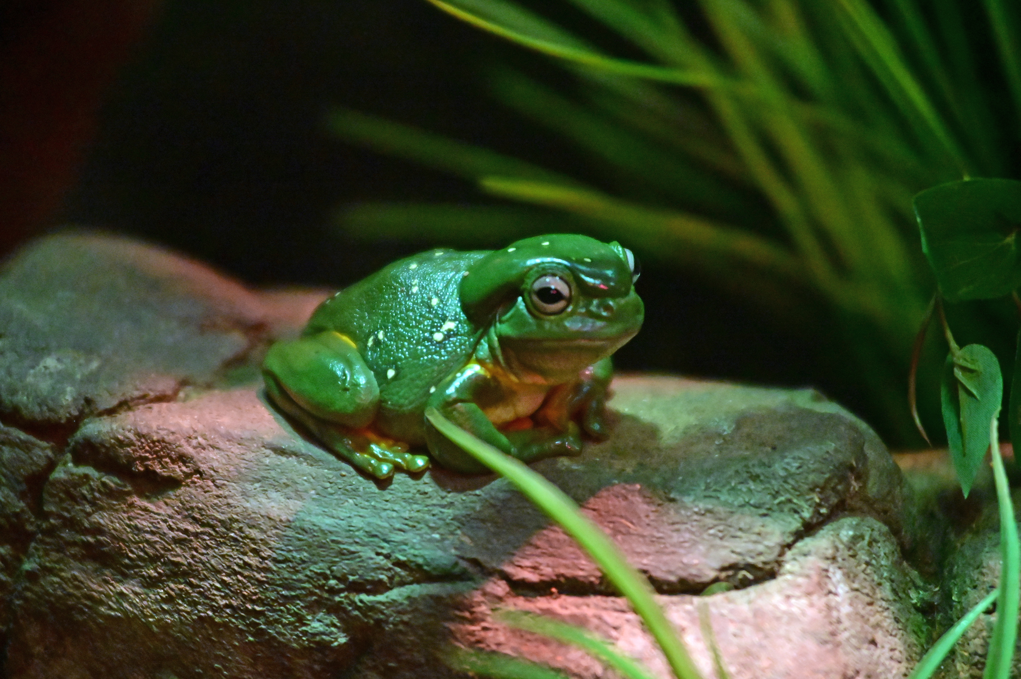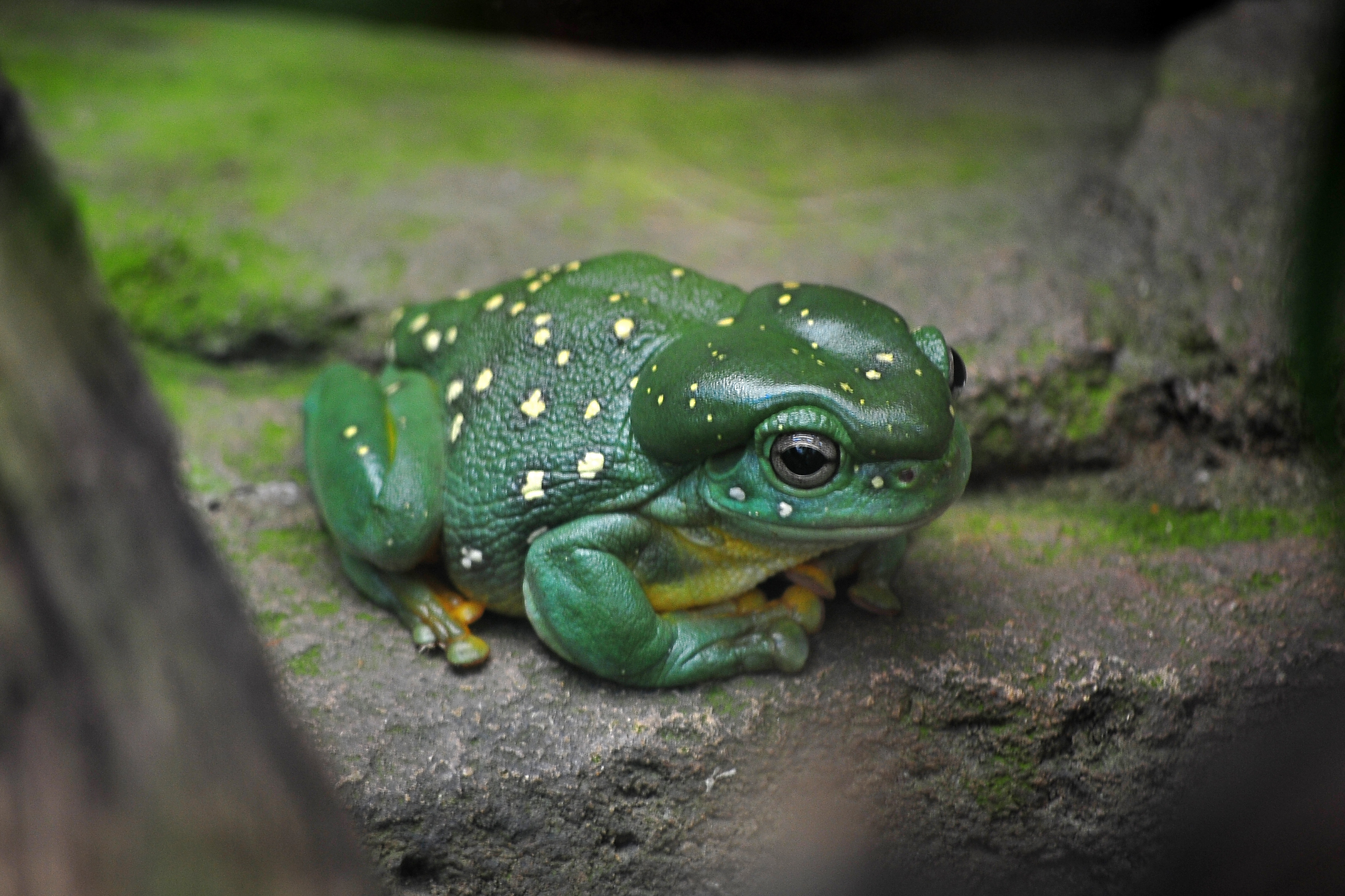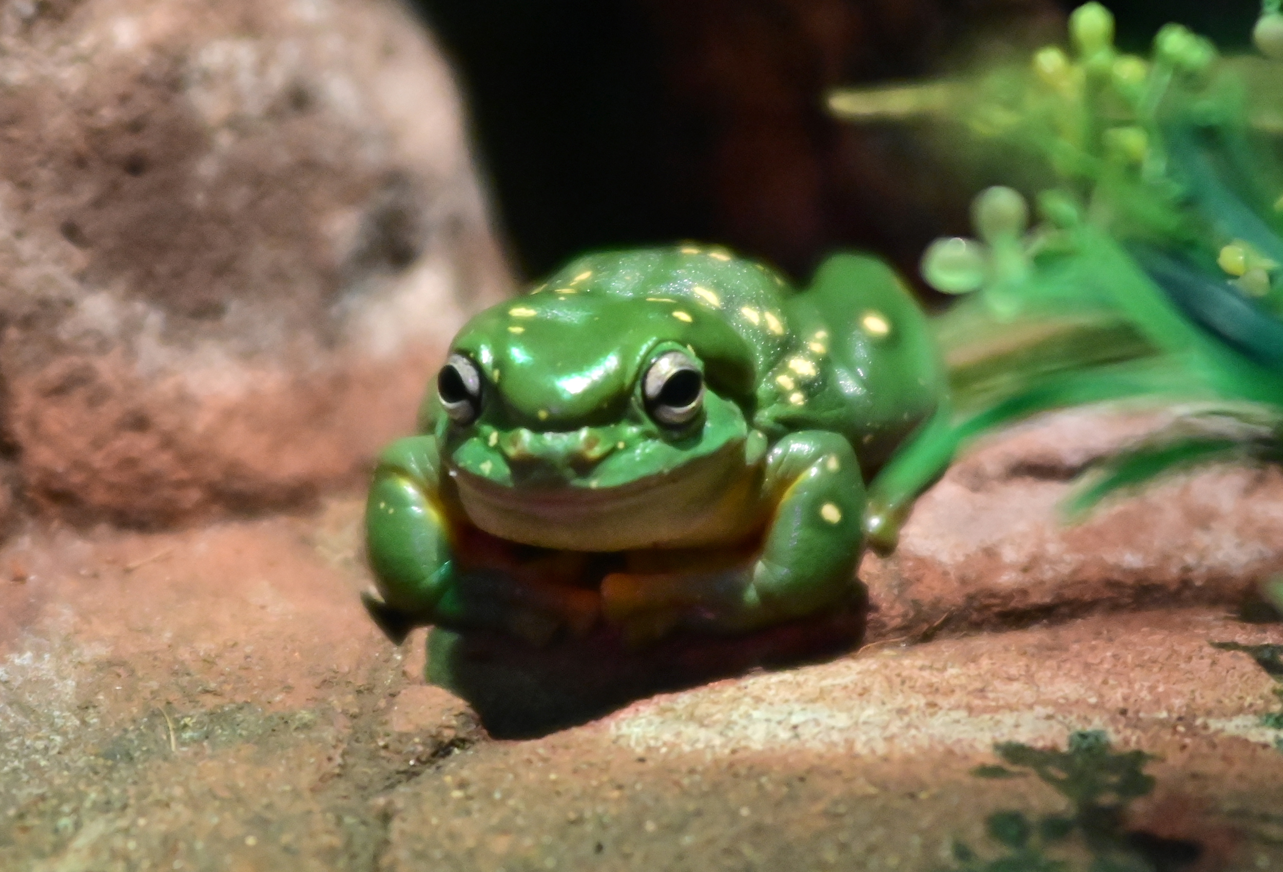 Other Names: Splendid Tree Frog, Ranoidea splendida Family: Pelodryadidae, Genus Litoria (Australasian tree frogs) which has 93 species, and usually several new species identified every year. Size: 8-13 cm Distribution: Magnificent tree frogs are native to the Kimberley region of Western Australia. It has a limited range, only occurring on the north-western coast of Australia in the Northern Territory and Western Australia. Habitat: They enter caves and rock crevices during the day. Much like the other large tree frogs in Australia, White's tree frog and the giant tree frog, they inhabit areas near humans, and can be found around buildings and in toilets, showers, and water tanks. References: Clulow and Swan, Wikipedia. About the Magnificent Tree Frog(From Wikipedia): The magnificent tree frog is a relatively large tree frog. The undersides of the feet and legs are bright yellow. Most specimens have white or sulphur-coloured dots on their backs, of varying densities. The older magnificent tree frogs can be distinguished from White's tree frogs by the presence of very large parotoid glands, which cover the entire top of their heads and droop over their tympana. It is kept as a pet; in Australia, this animal may be kept in captivity with the appropriate permit.
