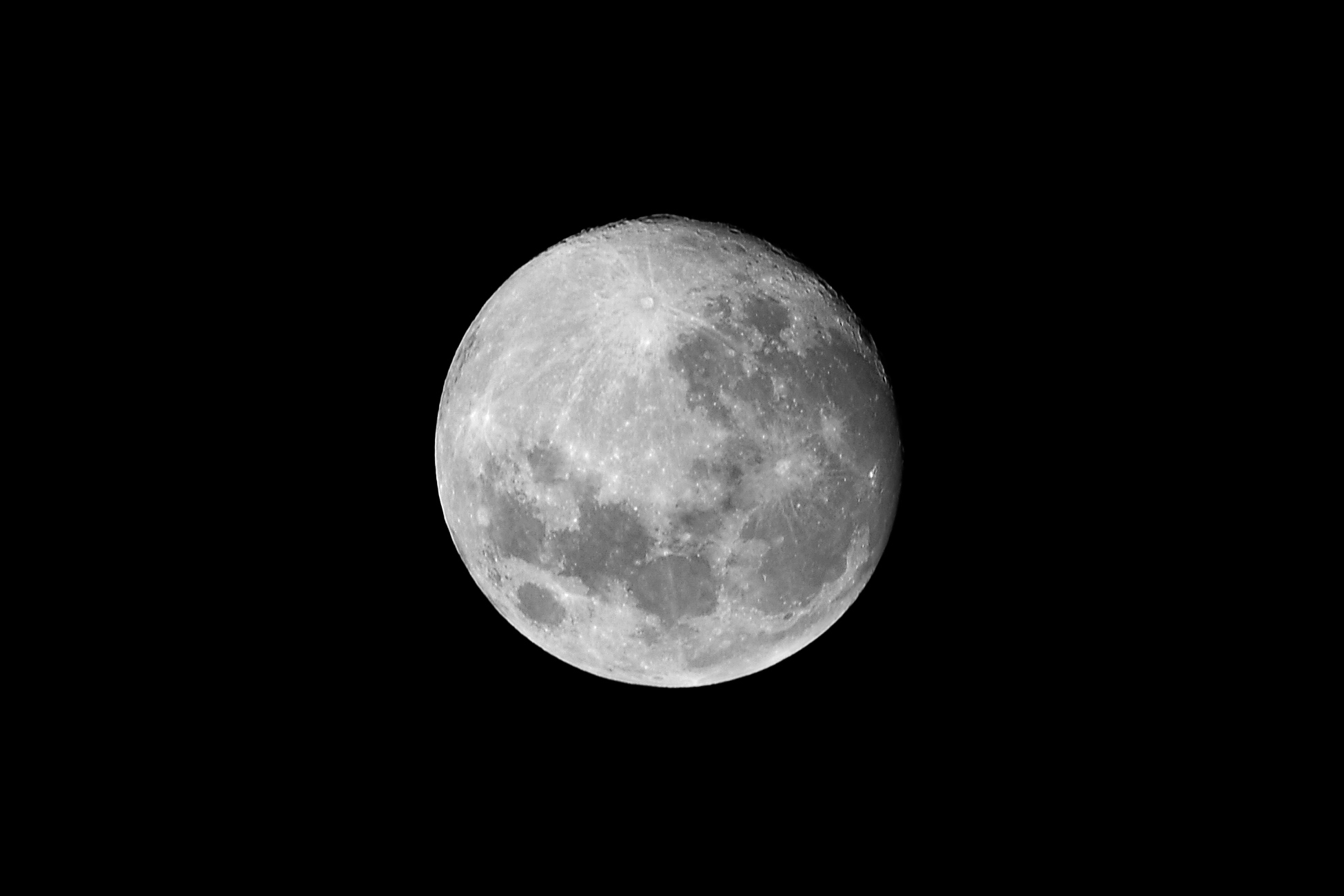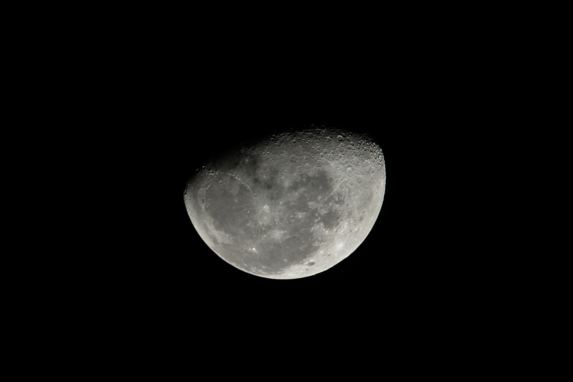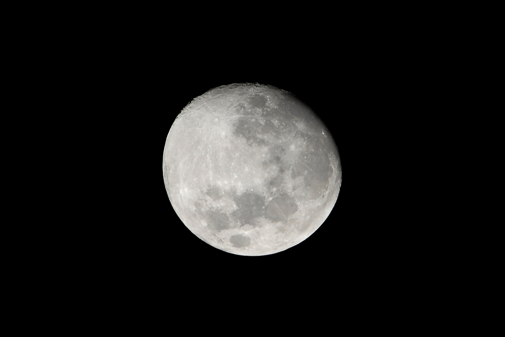 Tonight's best moon photo by visual inspection of the 11 that I took was again the biggest JPG file size. I didn't look at the file sizes until I'd gone through them looking to see what I thought was the sharpest one. The camera settings were 1/250th of a second, f/7.1, and ISO 125. The maximum aperture at 500mm on this lens is f/6.28 so this is just a little smaller than wide open — specifically 1/3 of an f-stop smaller. In photoshop I used Levels, then unsharp mask on a circular selection just slightly smaller than the moon itself (with a feathered edge on the selection). This meant the edges of the moon's image were not sharpened as the sharpening looked wrong on the edges. Then I used Curves to very slightly lower the darker midtones and slightly brighten the upper midtones. This increased contrast between the dark "seas" and the lighter parts of the moon. Below is exactly the same photo as it looks straight from the camera, without editing other than cropping, so you can see how much improvement Photoshop makes to the image.
