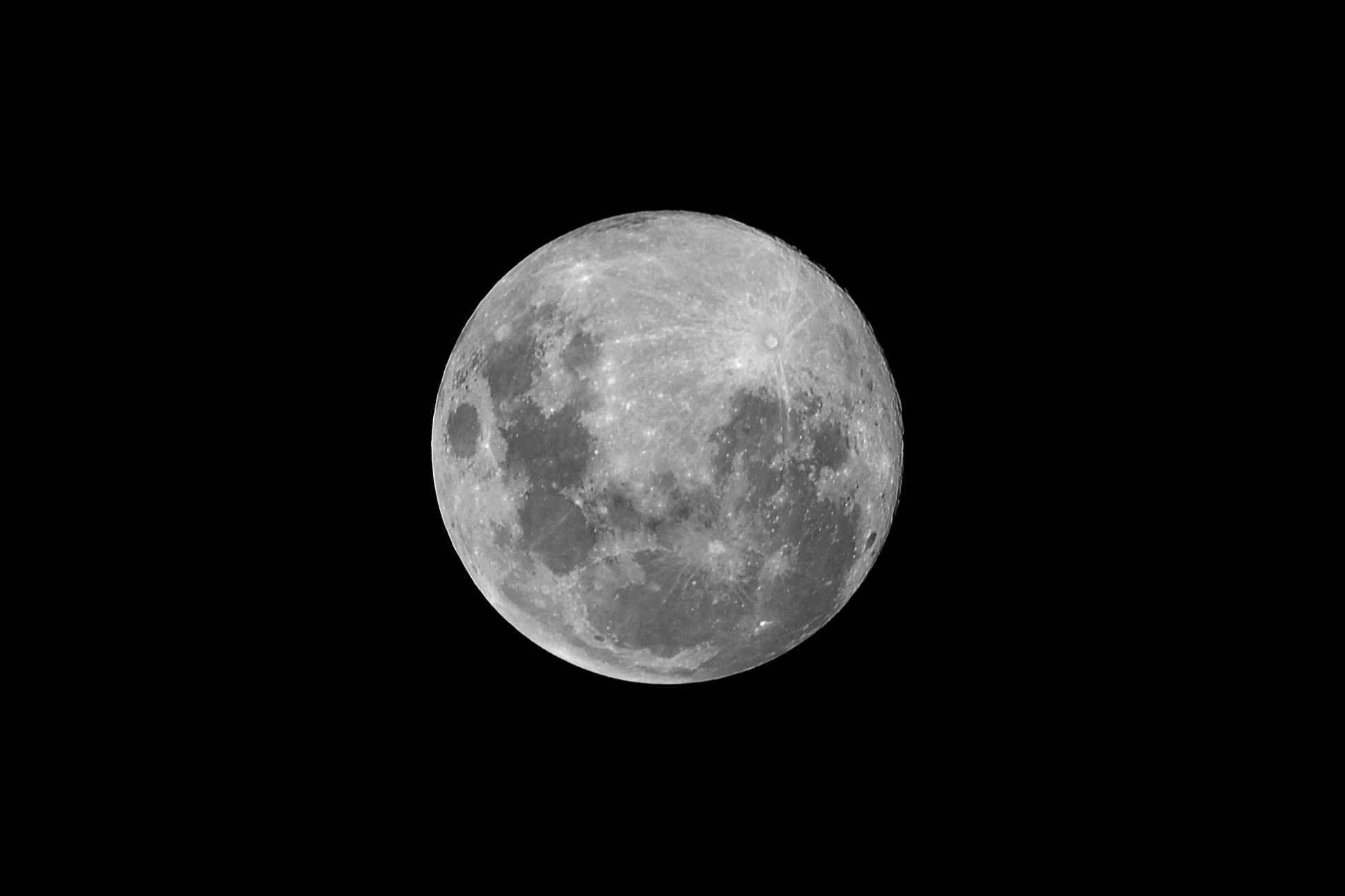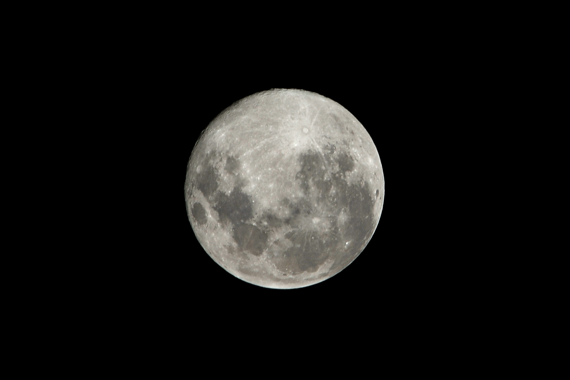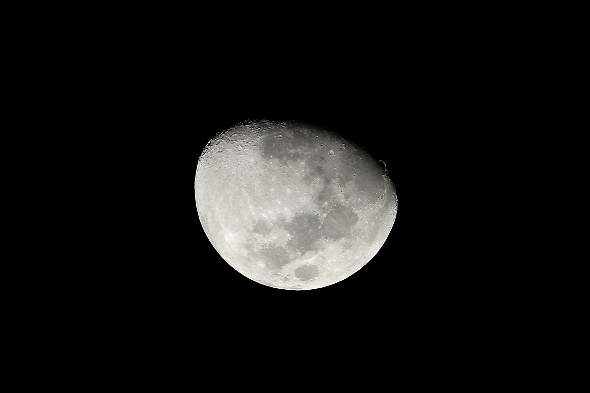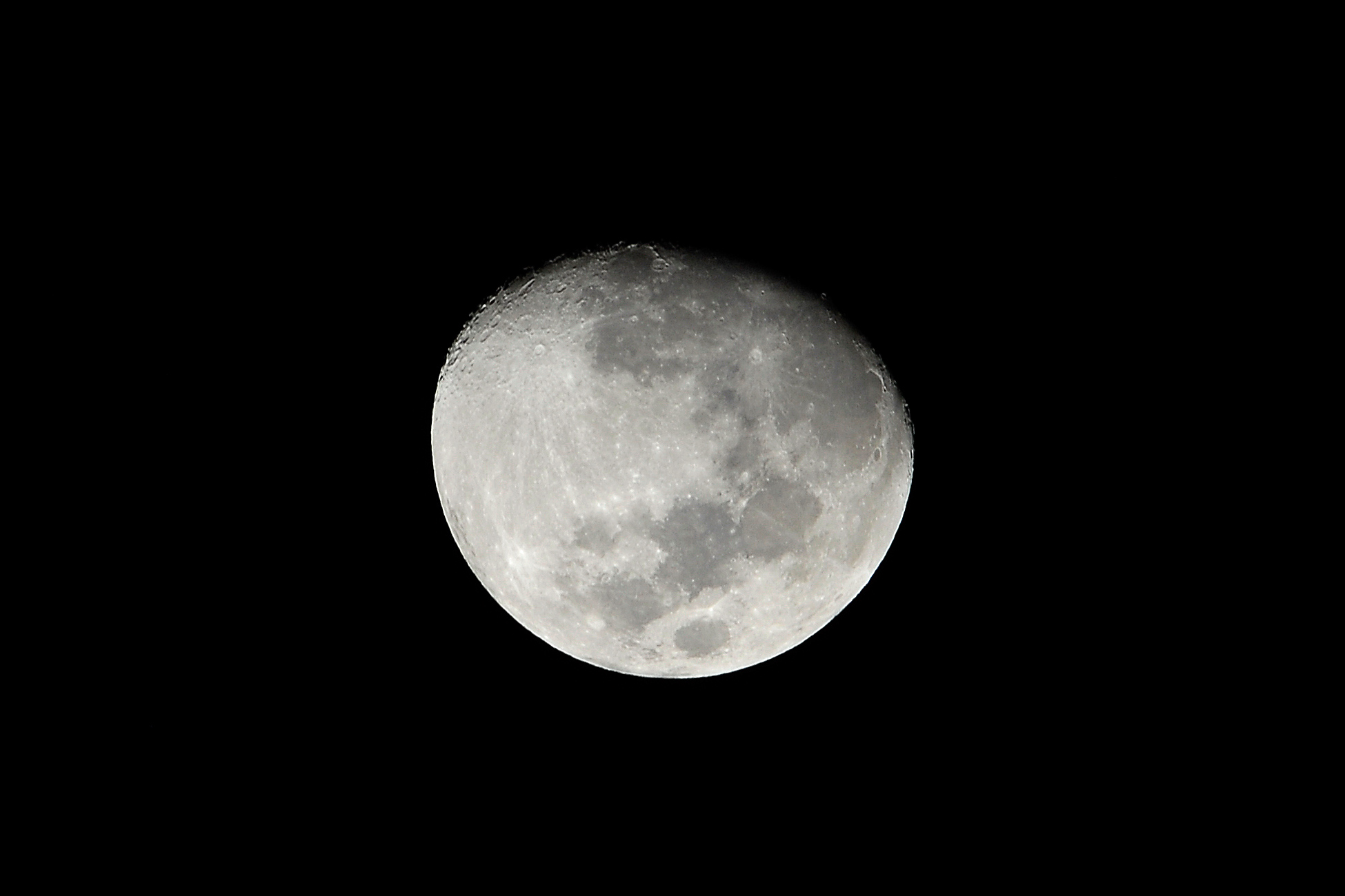 Tonight's best moon photo by visual inspection of the 11 that I took was again the biggest JPG file size. I didn't look at the file sizes until I'd gone through them looking to see what I thought was the sharpest one. The camera settings were 1/250th of a second, f/7.1, and ISO 125. The maximum aperture at 500mm on this lens is f/6.28 so this is just a little smaller than wide open — specifically 1/3 of an f-stop smaller. In photoshop I used Levels, then unsharp mask on a circular selection just slightly smaller than the moon itself (with a feathered edge on the selection). This meant the edges of the moon's image were not sharpened as the sharpening looked wrong on the edges. Then I used Curves to very slightly lower the darker midtones and slightly brighten the upper midtones. This increased contrast between the dark "seas" and the lighter parts of the moon. Below is exactly the same photo as it looks straight from the camera, without editing other than cropping, so you can see how much improvement Photoshop makes to the image.