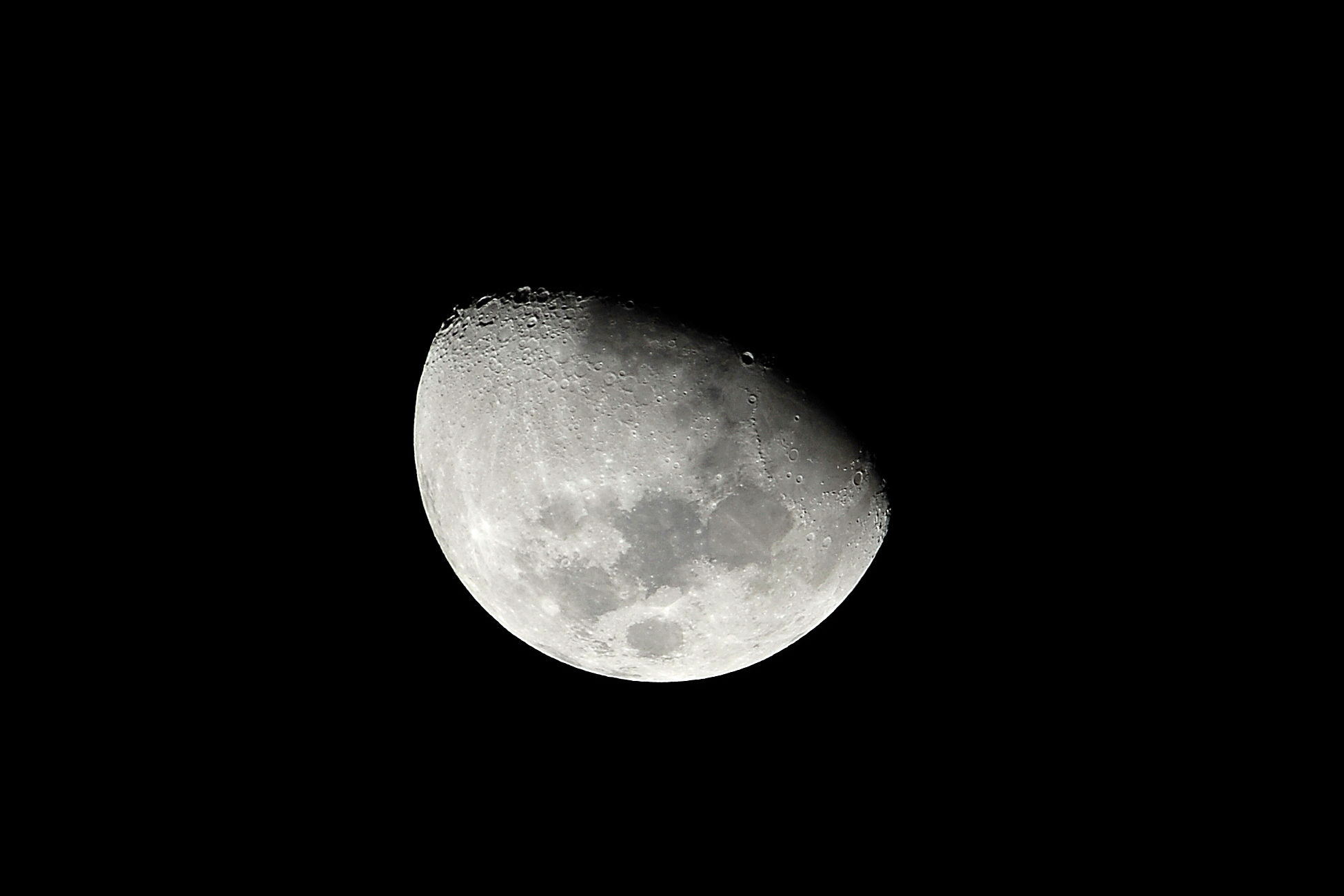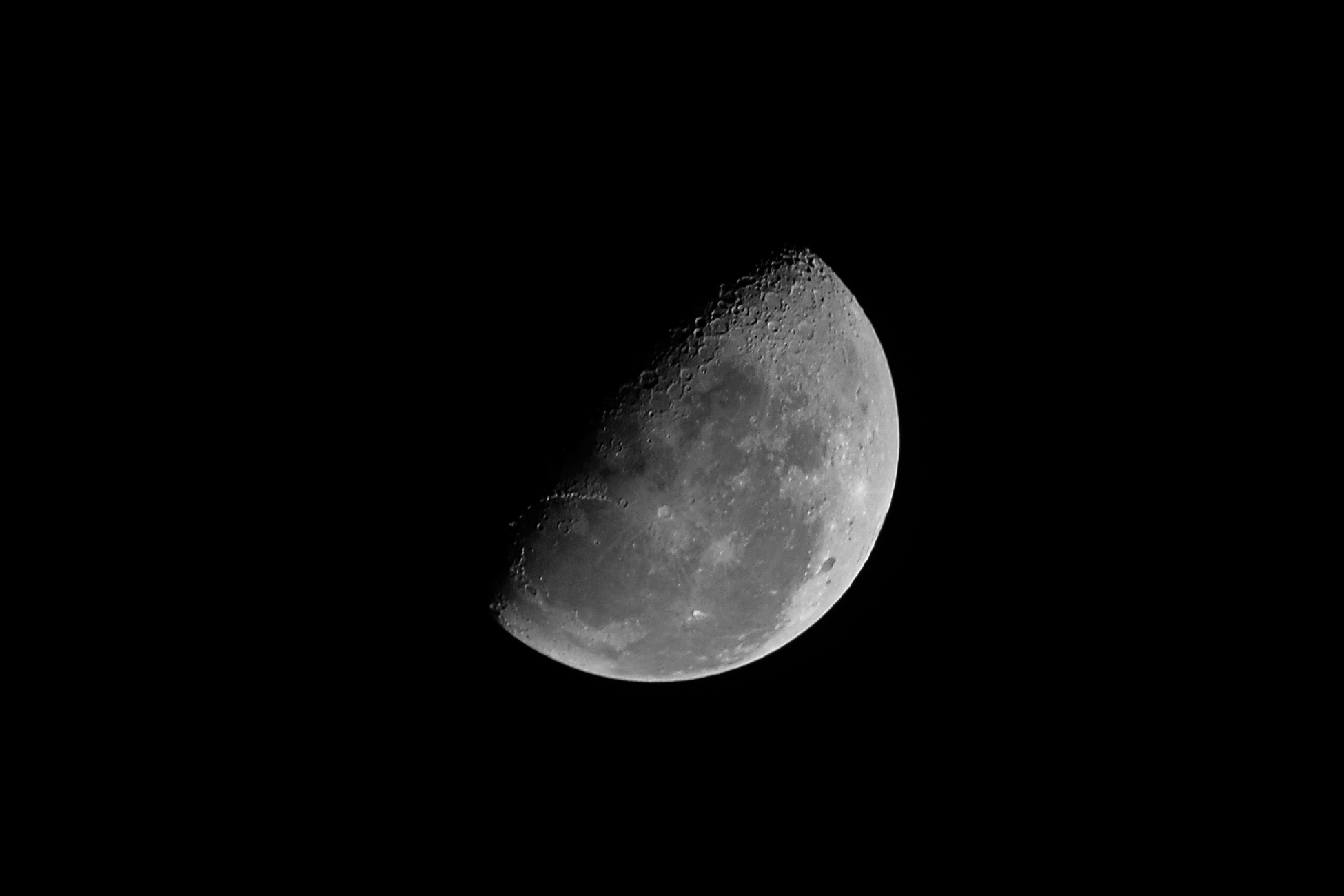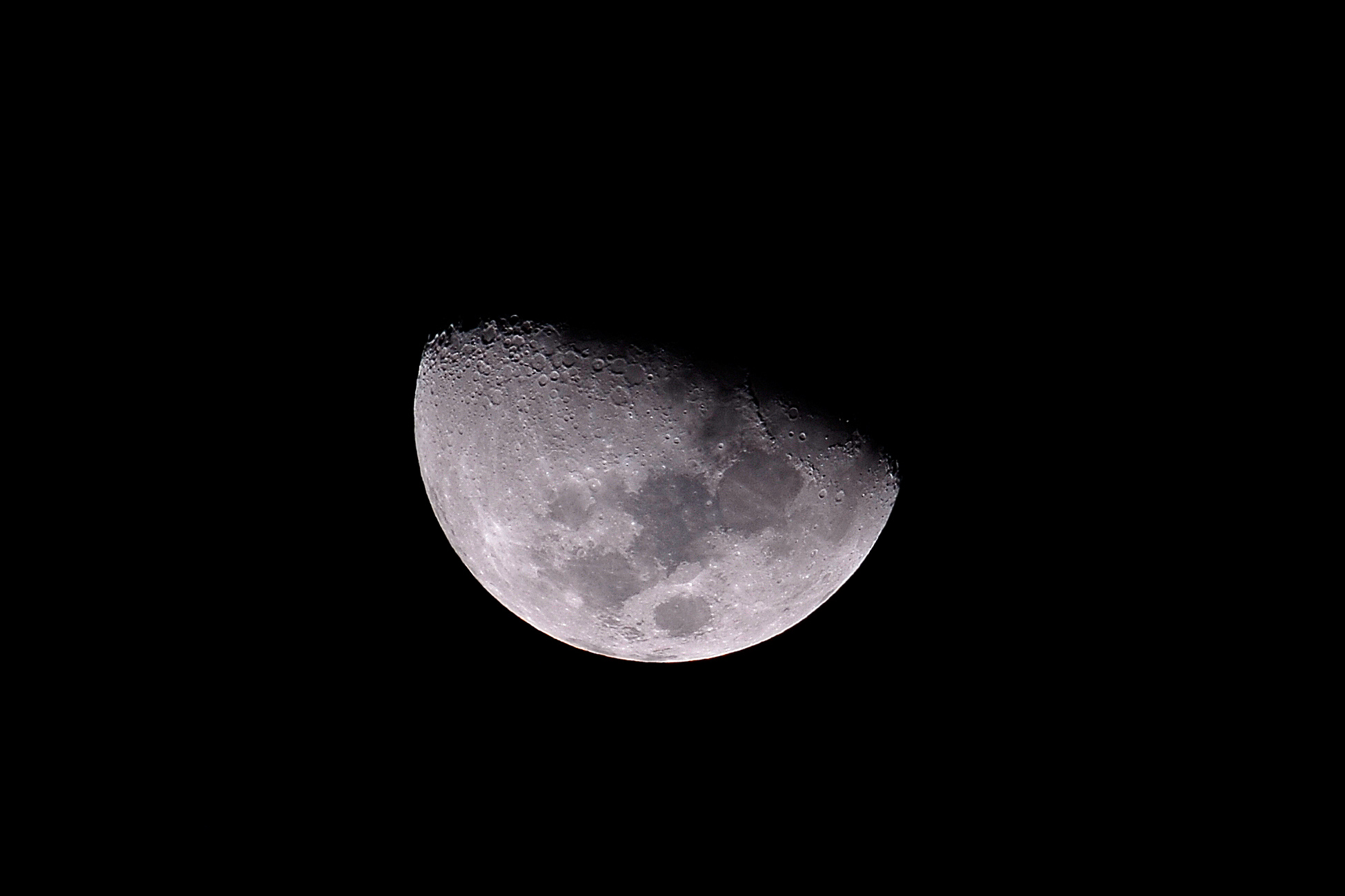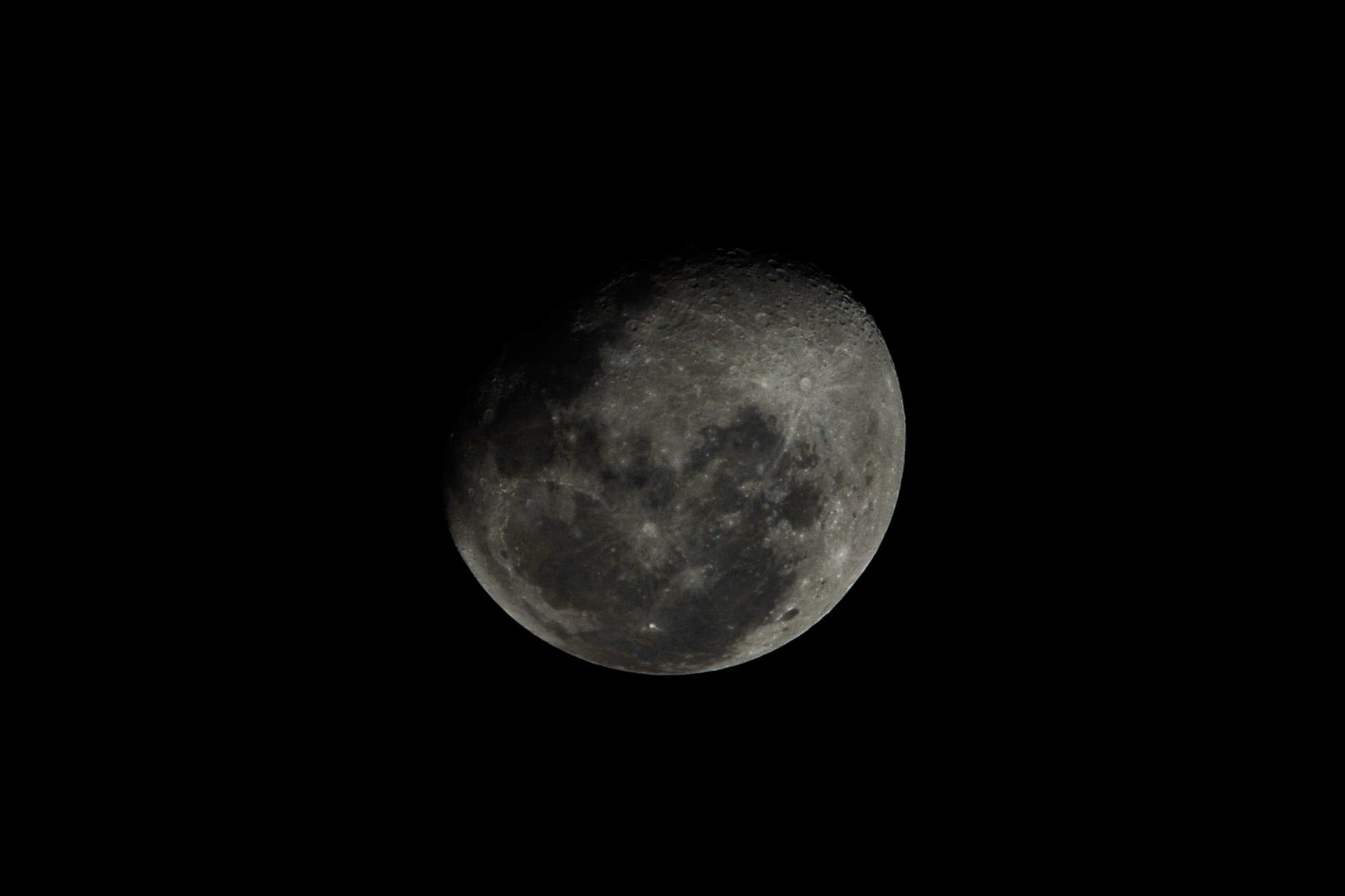 The dark grey area in the lower middle is called Mare Serenitatis (which means "Sea of Serenity"). Diagonally above and to the left of it is Mare Tranquillitatis ("Sea of Tranquility") which is close to the middle of this picture. Above and to the left of Mare Tranquillitatis is the much smaller Mare Nectaris ("Sea of Nectar"). Three craters can be seen on the right side of Mare Nectaris, called Theophilus, Cyrillus and Catharina, in order from lowest to highest in the photo. These craters are about 100 km each in diameter. The most prominent is Theophilus, which is 4200 metres deep and has a raised central mountain, 1400 metres high, which looks like a white dot in the middle of the crater on this image. Another thing you may have noticed is that the lunar features mentioned in the past few days (e.g. Mare Crisium) look less prominent now. This is because the parts of the moon close to the line of shadow where the moon is dark correspond to where the sun is low in the horizon as seen if you were on the moon itself. So the shadows are much longer and you can see them stand out more in the photos. Together, Mare Crisium and Mare Nectaris make up the two tall rabbit ears of the "rabbit in the moon" which some people can see when the moon is full or nearly full. Mare Tranquillitatis is the upper part of the rabbit's head, and Mare Serenitatis is the lower part of it's head. The rest of the rabbit is hidden within the shadowy black parts of the moon, which will gradually become visible over the next week. To see the rabbit the right way up, you need to be in the Southern Hemisphere. Day 56 - Wednesday 3 May 2017I went to my secret spot around 11 am. I upgraded my red picnic blanket with the rubber base to an olive green blanket from a Disposals store. It's 90% wool and 10% "blended fibre", with no plastic or rubber backing. It's larger than the red one, and the natural fibres and lack of an insulating back means that I'll be more electrically connected to the Earth, and also that in heavy rain it will get very wet, in which case I'll most likely use the red one again. The green colour is far less visible from a distance, which makes my sitting a lot more "secret" than it was with a bright red blanket that's very visible. I bought it yesterday afternoon and sat on it for the first time today. It felt really special, kind of like when you get new carpet in your house. There were a lot of bower birds around earlier today. When I was at my sit spot, there were many small birds high up in the trees. I think they were thornbills. I also saw a grey fantail, and a currawong, and a bird far away I think was a wattlebird. Unfortunately the sky was completely clouded over and I didn't get a photo of the 7 day old moon. I did see it briefly through a gap in the clouds when I was driving home around 10pm, but I didn't have my camera, and when I got home it was nowhere to be seen. The line of the Sun's shadow was straight. This is usually called a quarter moon, because the moon is 1/4 of the way around it's monthly orbit of the Earth. Sometimes people call it a half moon because half of the moon is lit up by the Sun and the other half is dark in shadow. When at this phase, 1/4 of the way around, the moon is at its highest point in the sky as the sun is setting. And the moon sets at midnight, when the sun is at it's lowest point. It also rises at noon. Day 57 - Thursday 4 May 2017 - 8 Day Old MoonI went to my secret spot around the middle of the day. I sat on the new mat, read some of my Kamana manuals and practiced being quiet and using wide-angle vision ("owl vision"). Here is the moon from tonight. An 8 day-old moon sets approximately 1 am. Since it's past the quarter moon phase, at sunset the moon will be further back towards the East than its highest point in the sky, and it will reach it's highest point in the sky sometime after sunset. I used a different camera, a Nikon D200 which is an older camera, and the same lens as before. It has a smaller sensor meaning the image on the photo looks larger. The D200 has 10 megapixels versus 12 megapixels for the D700, but since the sensor on the D200 is 1.5 times smaller, there are more pixels across the moon image, so it looks higher resolution.