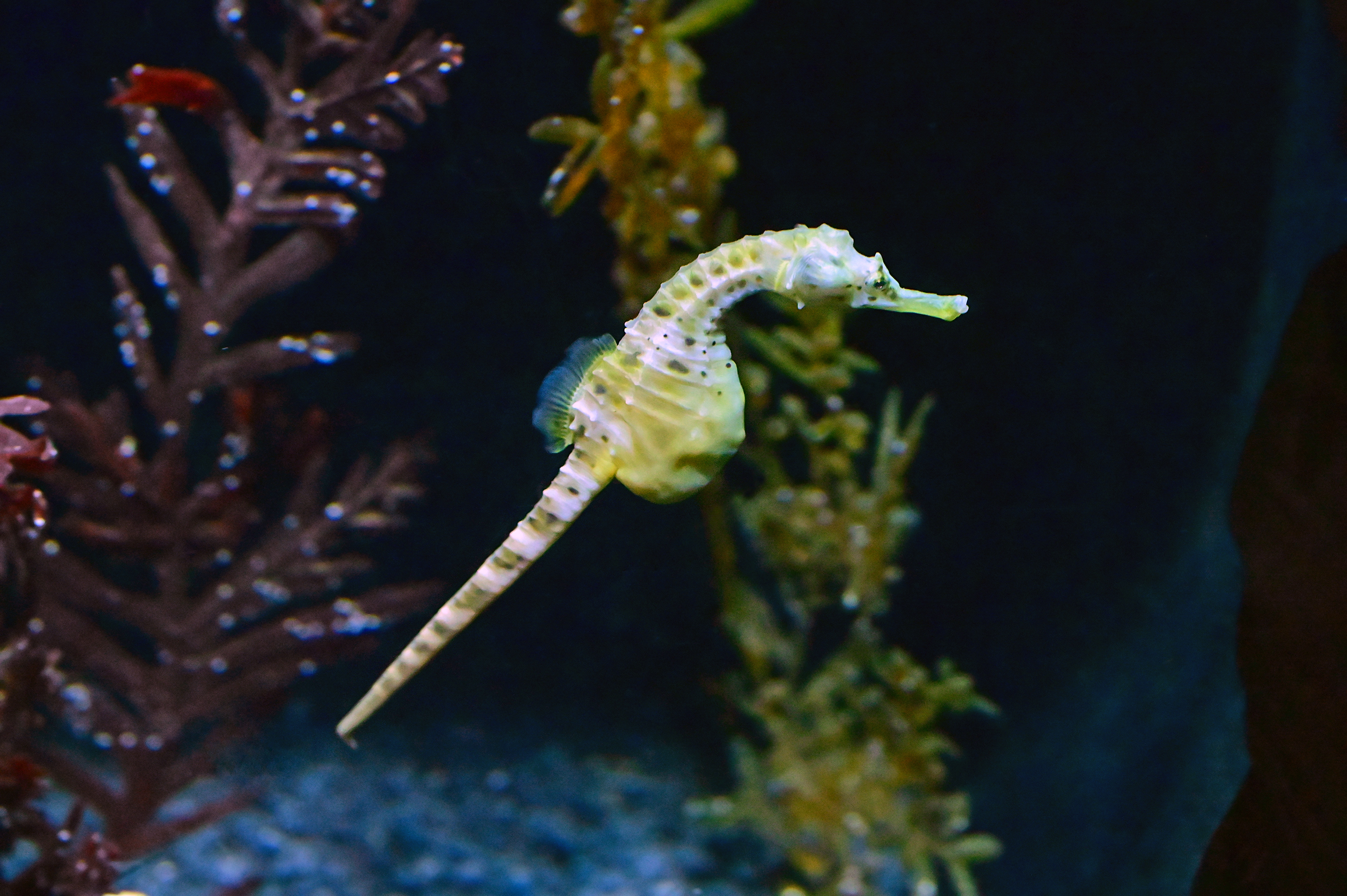 Other Names: Big-belly Seahorse Family: Syngnathidae, a family of fish which includes seahorses, pipefishes, and seadragons. The name is derived from Greek, σύν (syn), meaning "together", and γνάθος (gnathos), meaning "jaw". This fused jaw trait is something the entire family has in common. Size: Up to 35 cm, the largest seahorse in Australia and one of the largest in the world. Distribution: Southeast Australia and New Zealand Status: Least concern Habitat: The pot-bellied seahorse is found among algae, seagrasses, and rocky reefs in shallow water, and attached to sponges and colonial hydroids in deeper areas. They also attach to jetty piles and other manmade objects, and can be found in estuaries. They usually inhabit waters less than 50 m (160 ft) deep, but have been found as deep as 104 m (340 ft). Juveniles are pelagic or attached to drifting seaweed. References: Wikipedia. About the Pot-bellied SeahorseThe pot-bellied seahorse has a forward-tilted, a long-snouted head, a distended but narrow pot belly, and a long, coiled tail. Habits: Each eye moves separately, making it easier for them to see food and predators. Posture: The pot-bellied seahorse swims using its dorsal fin with a vertical stance. Diet: When not swimming, it coils its prehensile tail around any suitable growth, such as seaweed, waiting for planktonic animals to drift by, when they are sucked up by the small mouth set at the tip of the snout much like a vacuum cleaner. Seahorses are voracious feeders, eating mainly crustaceans, such as shrimp, and other small animals living among the seaweed, such as copepods and amphipods. They do not chew, so they can eat to excess because of their small gut tract. Breeding: Distinguishing males from females is easy: The male has a smooth, soft, pouch-like area at the base of its abdomen (i.e. belly) where the stomach meets the tail on the front side. Males also have a fin there, but it is less obvious. The female has more of a pointed stomach with a very obvious fin at the base of it. Economics: The pot-bellied seahorse is a popular aquarium species. Dried specimens are sold as traditional medicine in Asia, though the idea of eating a seahorse would make me feel sad, almost like eating a friend or pet (or actual/mammal horse). Stocks come from the wild or are aquarium-reared. They are easy to keep in aquariums and feed on small shrimp and crustaceans.