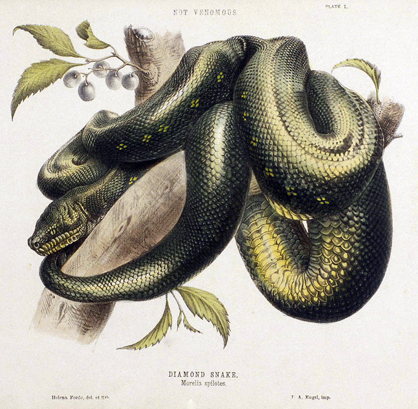 Diamond PythonMorelia spilotaDanger: Non-venomous The Diamond Python is perhaps the most common snake found in the Blue Mountains and Sydney (and much of eastern Australia). About half (at least) of all the snakes I have seen in the wild have been diamond pythons. The colours and patterns on them can vary a lot. They are not dangerous as they have no venom, and many people keep them as pets. The flatmate of one of my friends used to have one that he called "Jake the Snake". Though they can still bite (like most wild animals), so if you see one in the wild do not try to handle it.