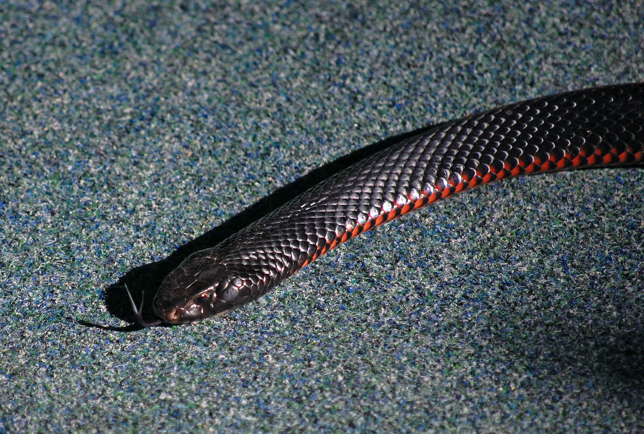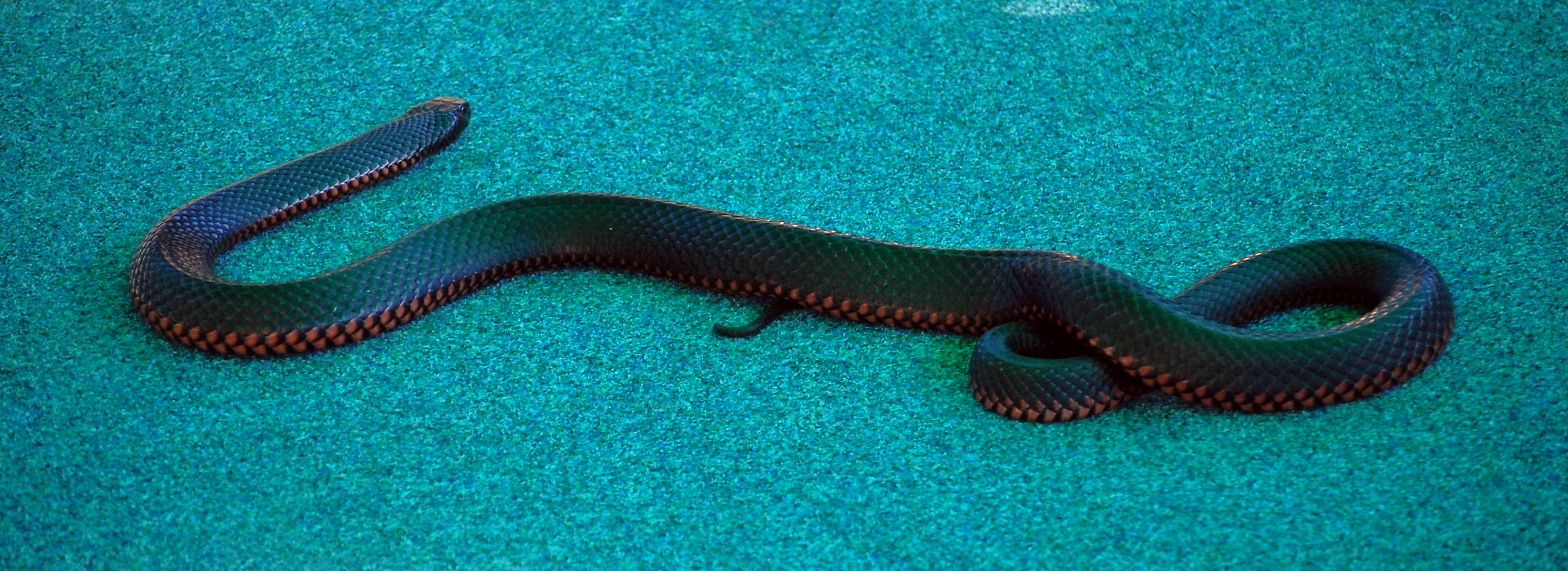 Red-bellied Black SnakePseudechis porphyriacusDanger: The Red-bellied Black Snake is one of the common dangerous snakes found in the Blue Mountains and Sydney (and much of eastern Australia). It is not one of the really dangerous snakes, though. My field guide (Cronin) says it is reluctant to bite, and only one human has died from being bitten. This is just as well as one almost crawled (slithered?) right over my head once when I was about 18. I was lying on my back on a rock in the bush and a friend said "There's a black snake behind your head". He was right and it was about 3 feet (1 metre) away from my head, moving in my direction. I got up and the snake didn't seem too worried about me, although we all left the area pretty fast after that. In pencil in my field guide I have written "0.8% chance of mortality with no antivenom", and a reference to "TP&A", though I can't remember what book that is — I will fix that up later... They are often found near water, and I have heard that they like to be low down in valleys more than high up on ridges. I have seen them near water though the one that crawled up to me was high up on a ridge.