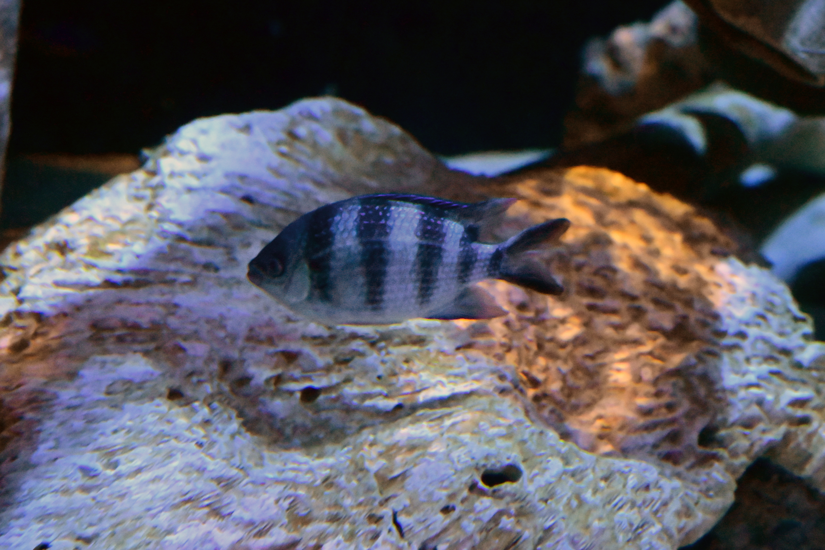 Other Names: Striptailed damselfish Family: Pomacentridae, the damselfish and clownfish family. Size: To 22 cm Distribution: Around the coasts of most of Australia except for the southern waters of WA, SA, Vic, and not around TAS. West to the Red Sea, north to Japan, and east to French Polynesia. Status: Least concern. Habitat: Shallow rocky shorelines and coral reefs. References: Kuiter, Edgar, Stuart-Smith et. al, Wikipedia. About the Scissortail SergeantThe Scissortail Sergeant has a white or pale blue body, with five vertical black bands. Two horizontal bands are also often (but not always) present on the lobes of their tail. Their common name comes from the similiarity of their stripes to the stripes found in military insignia (i.e. of a sergeant). Diet: The Scissortail Sergeant eats algae, zooplankton, and sometimes its own eggs. Also small crustaceans and larval fishes. Economics: The Scissortail Sergeant is popular in the aquarium trade.
