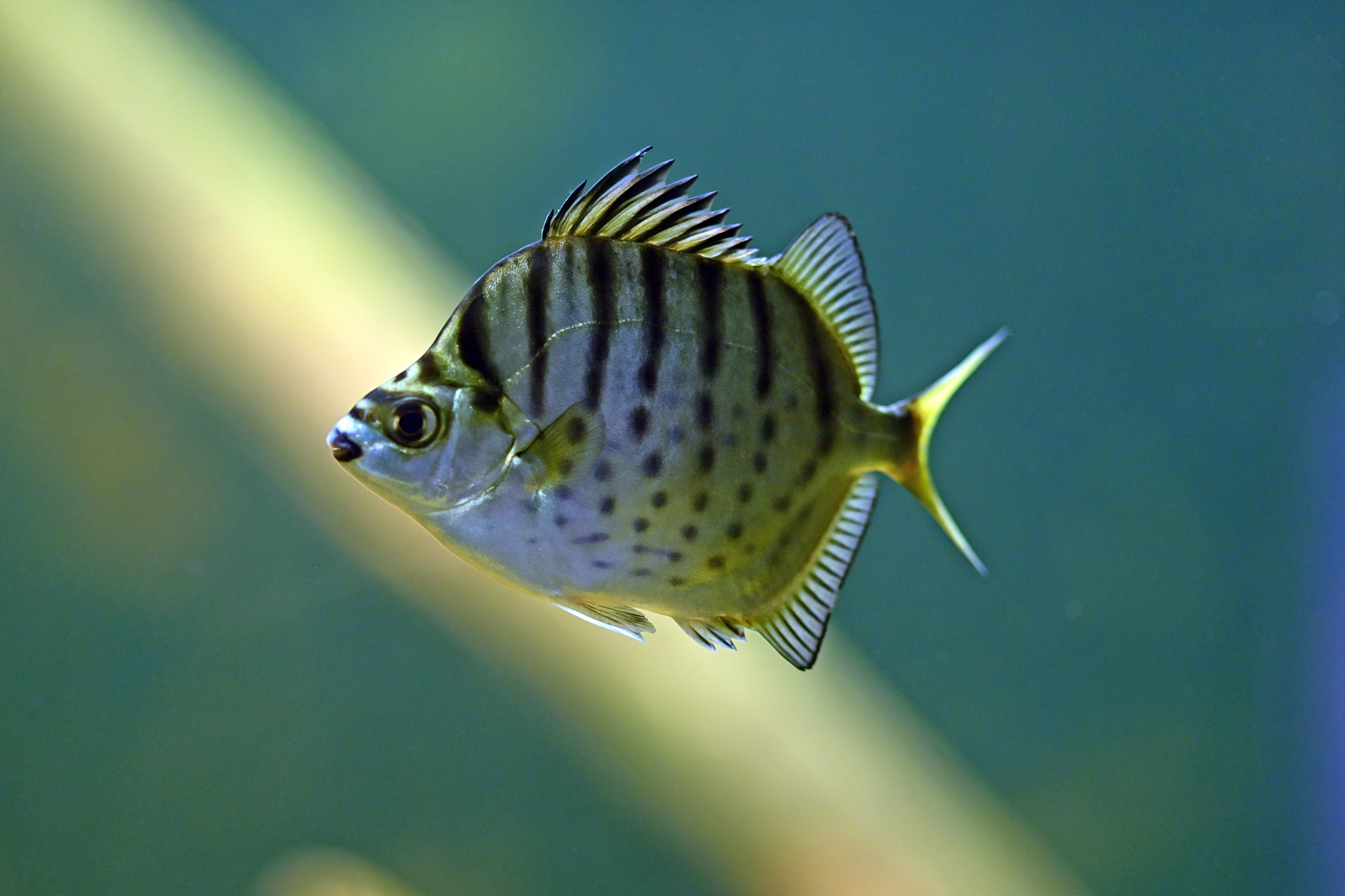 Other Names: Spotbanded scat, striped butterfish or barred scat. Family: Scatophagidae, the scat family is a small family of fishes in the order Perciformes. Size: To 28 cm Distribution: Throughout Indonesia, northern Australia and Papua New Guinea. Habitat: The Silver Scat likes to inhabit brackish mangrove estuaries and coastal freshwater. References: Kuiter, Edgar, Stuart-Smith et. al, Wikipedia. Danger: The fin spines of the Silver Scat can inflict painful wounds. Economics: Some species of scats are popular in the aquarium trade.