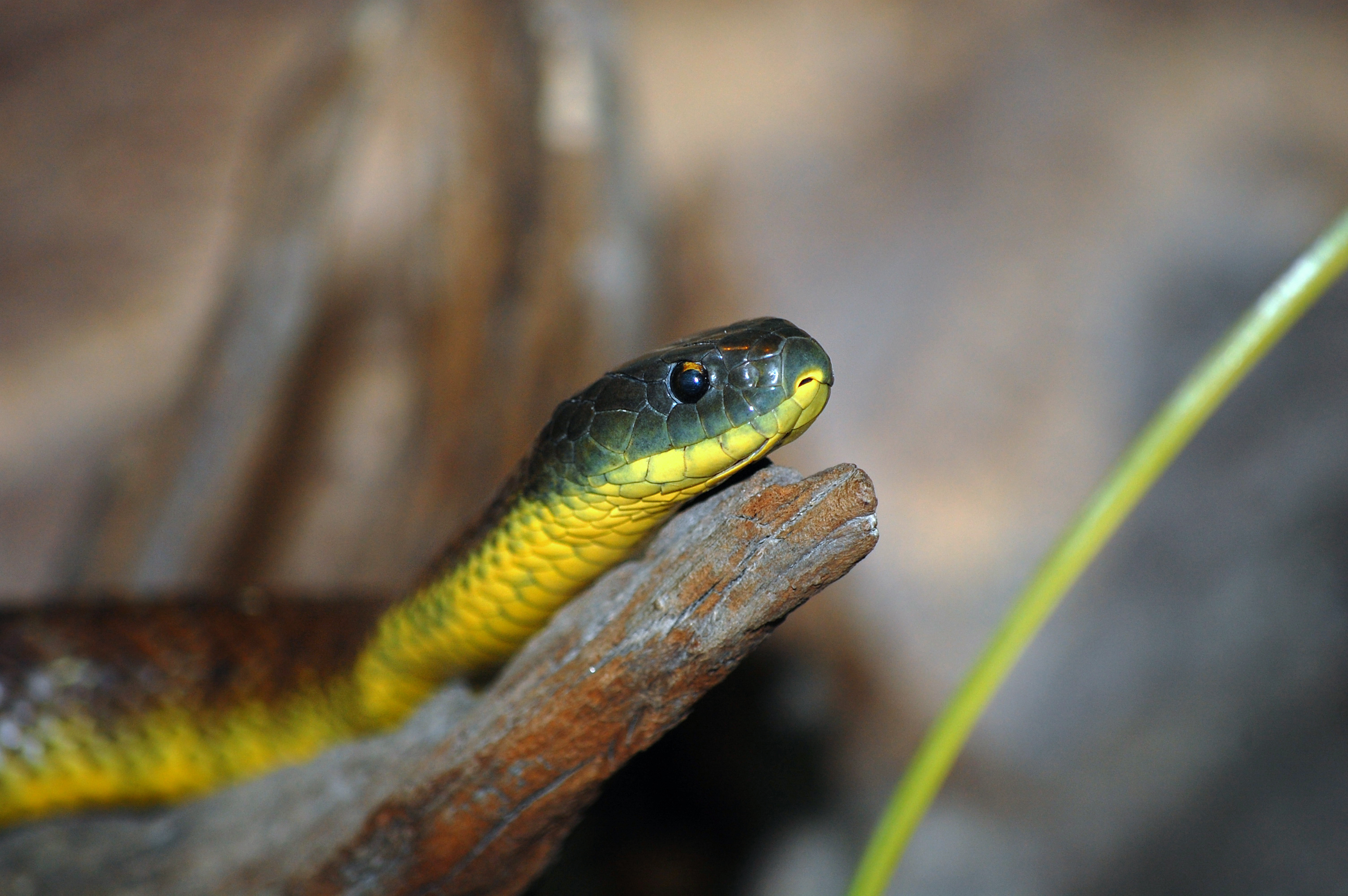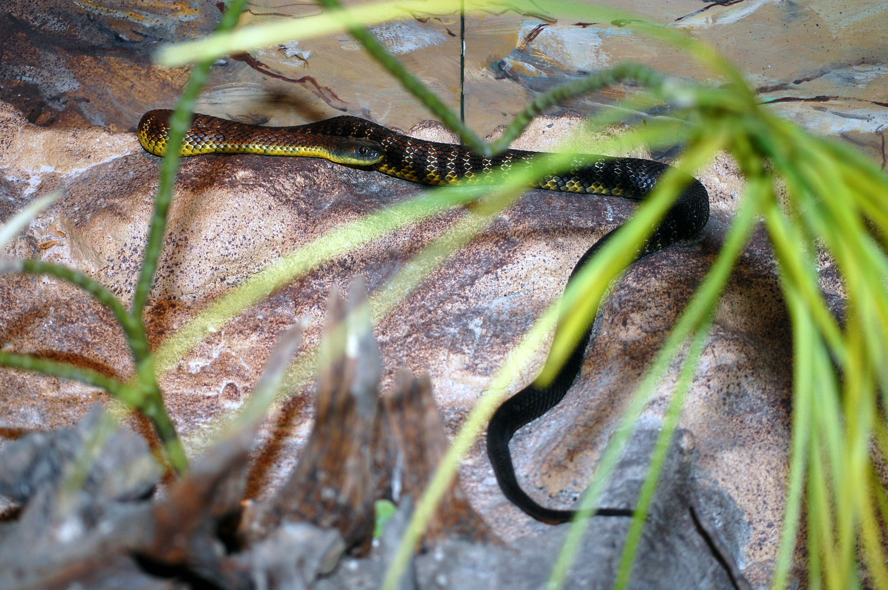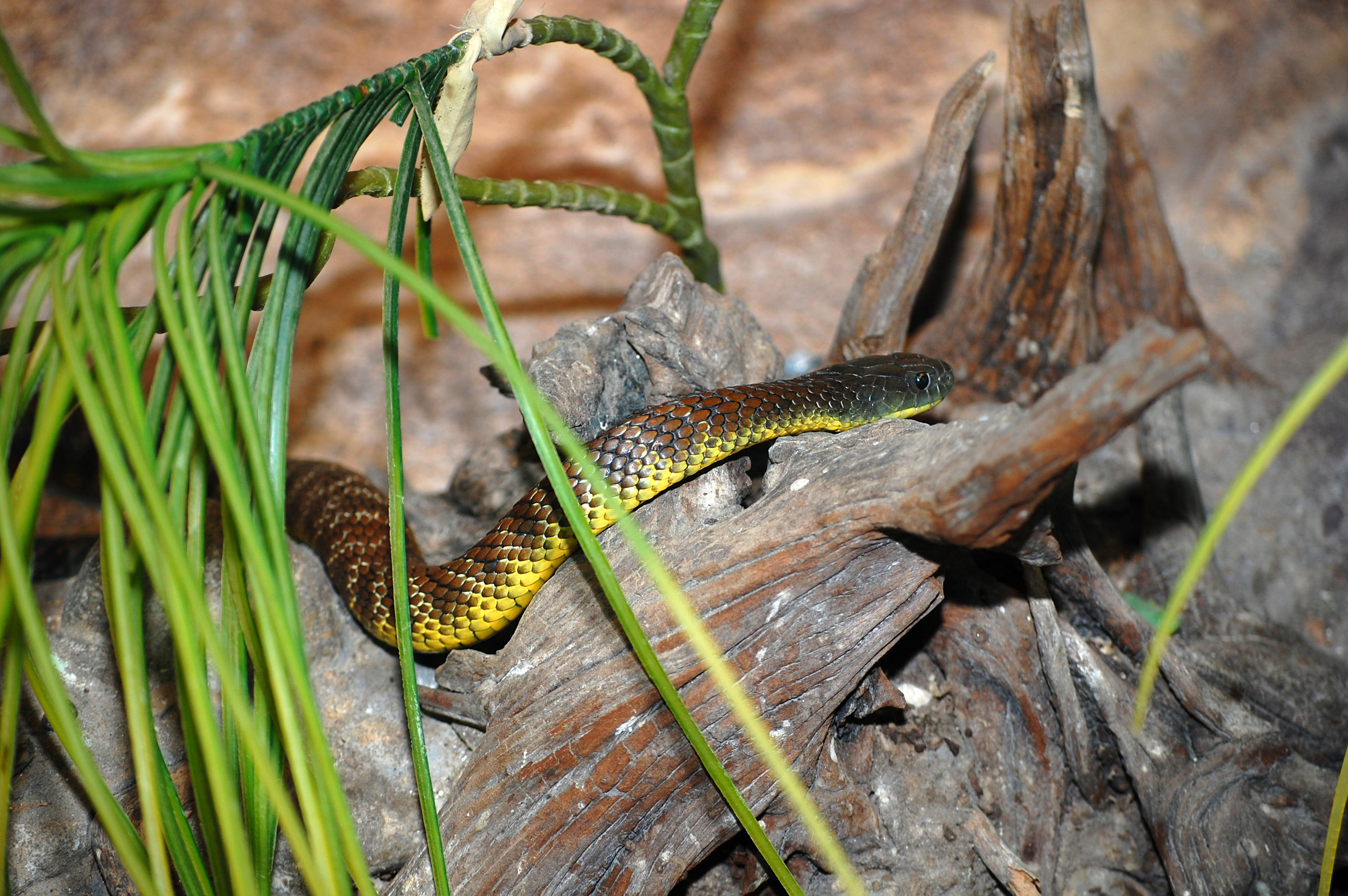 Danger: Family: Elapidae (Elapid snakes, about 60 species in Australia, about 300 species in the world) Size: 0.9 to 2 metres Distribution: In the south and relatively coastal areas of Australia, to a few hundred km inland, about 2/3 of VIC, and all of TAS. To as far north as the southern parts of coastal QLD. Habitat: Rainforests in the north parts of their range, and dry forests in the southern parts of their range. References: Wilson and Swan. About the Tiger SnakeTheir colour and appearence can vary widely, from completely black all over (these are found mostly in the very south of SA and islands of Bass Strait), to much lighter olive-yellow colours. They may have bands (like "tiger stripes") or be patternless. Those on the mainland are most often striped at least somewhat. Diet: The tiger snake feeds mainly on frogs though they also eat lizards, small birds and mammals. Breeding: Produces large litters of live young. As many as 64 baby tiger snakes in the one birthing have been recorded! Danger: When provoked, it flattens its head and neck and raises up towards its aggresor. Tiger snakes are very dangerous.