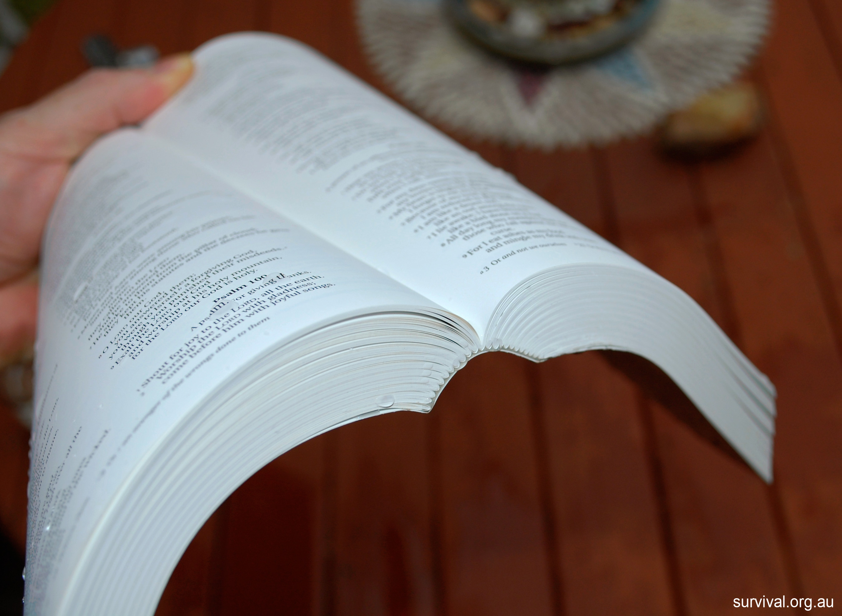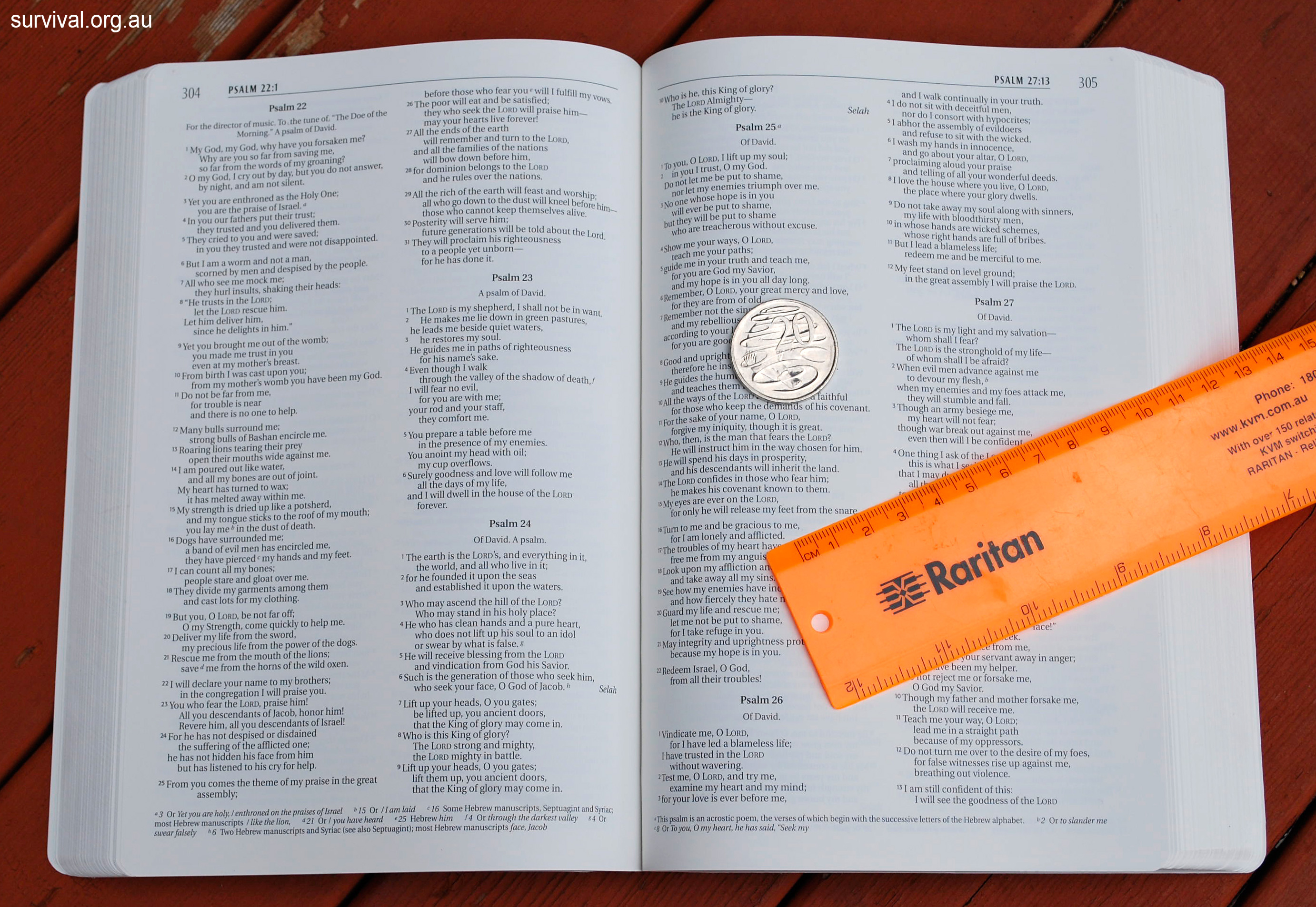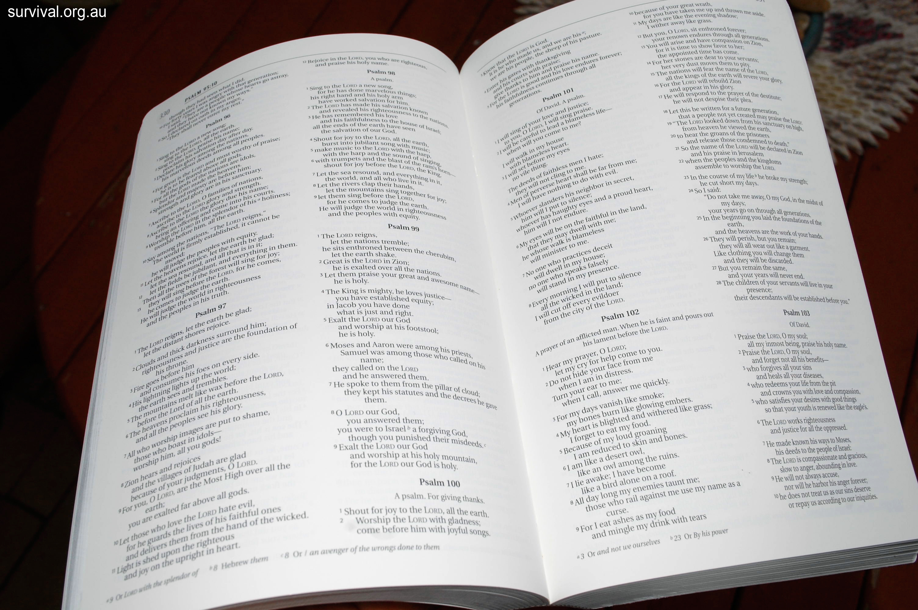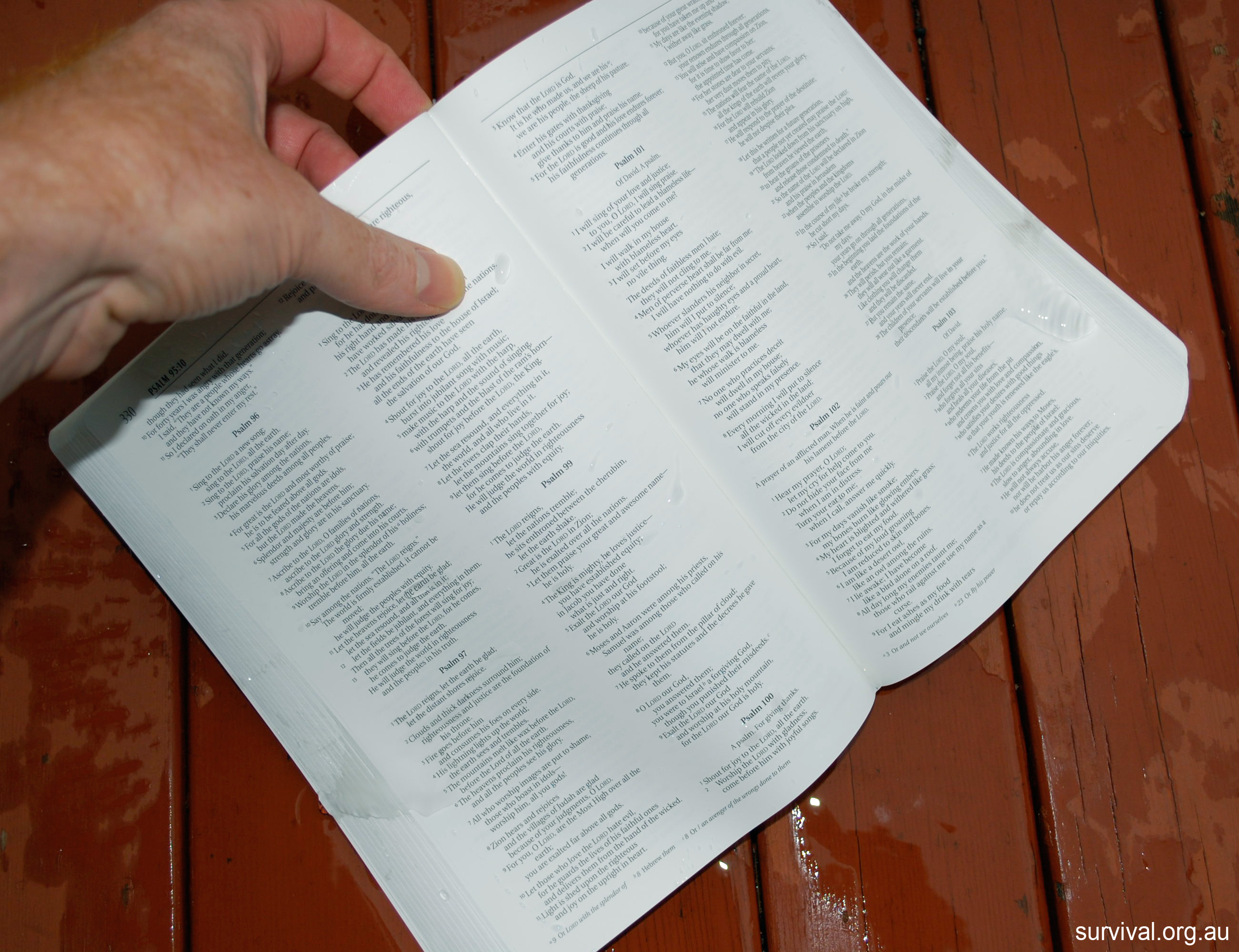Other Bible TranslationsThe NIV translation of the Bible (The New International Version) shown above is the most popular Bible translation used in non-Catholic churches. You can get the Waterproof Bible in a few other translations (apart from the New International Version or NIV). It also comes in the ESV, NLT and KJV versions. Also (published recently, in October 2010) you can get the New Testament with Psalms and Proverbs, which is smaller and lighter (about half the weight) to carry around, though the font is slightly smaller again (7 pt versus 8 pt). Click here to browse other translations and/or the New Testament from Amazon See Also Jesus bible cover high pages photo plastic resolution waterproof Content is copyright © Survival.org.au 2005-2025 All Rights Reserved. Terms of Use. Definitely read the disclaimer before trying anything from this website, especially including the practices and skills. This website uses affiliate links – this doesn't cost you any more, but I get a commission on purchases made through the website. As an Amazon Associate I earn similarly from qualifying purchases. |